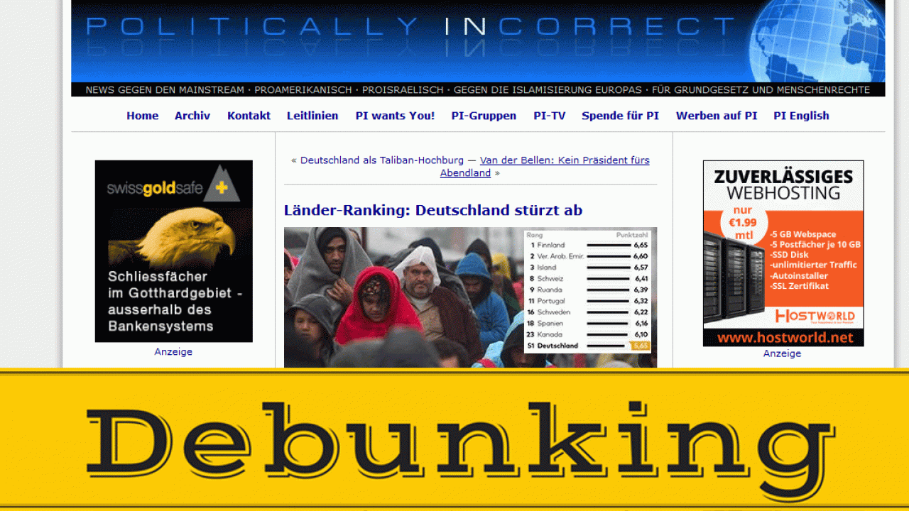 In einem Text des rechtspopulistischen und islamfeindlichen Blogs “Politically Incorrect” (PI) mit dem Titel „Länder-Ranking: Deutschland stürzt ab“ (vom 26.04.2017) von einem Autor mit dem Alias-Namen „Chevrolet“, wird wieder einmal Stimmung gegen Geflüchtete gemacht.