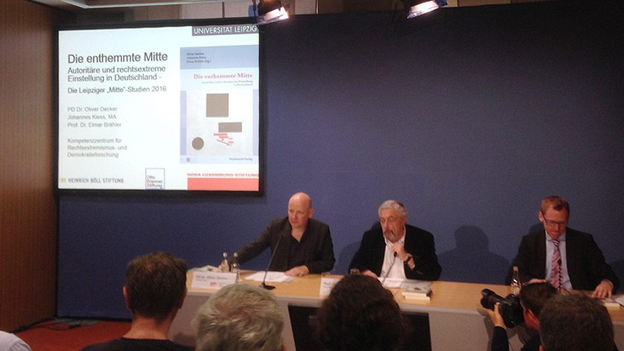 Oliver Decker, Johannes Kiess, Elmar Brähler (Hrsg.):Die enthemmte Mitte.Autoritäre und rechtsextreme Einstellungen in Deutschland.Psychosozial-Verlag, Gießen 2016249 Seiten.