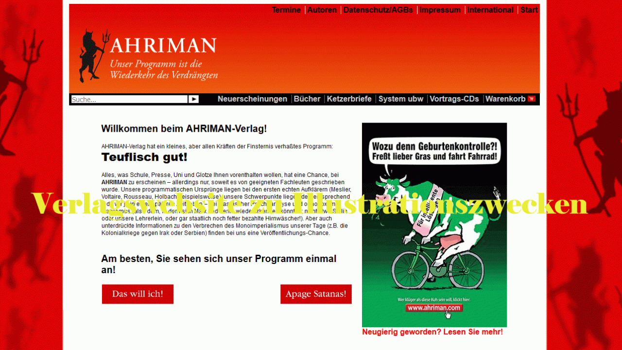 Dieser Verlag bezeichnet sich selbst in kruder Weise als „links und damit Voltairiane“, allerdings erscheinen hier u. a. Bücher mit Titeln wie „Die Flutung Europas mit falschen Flüchtlingen. Vom Dreisam-Mörder Hussein Khavari, seinem Umfeld und dessen Schutzengeln“ (2018), in denen von „Rapefugees“, der „Soros-Verschwörung“ und dem „Zerrspiegel der Lügenpresse“ die Rede ist. Diese Sprache kennt man von Akif Pirinçci, PEGIDA und AfD und sie findet sich in zahlreichen anderen Veröffentlichungen des Verlags wieder. Er bringt außerdem die Ketzerbriefe des Bundes gegen Anpassung heraus, eines Überbleibsels aus der Zeit der K-Gruppen der 1970-er Jahre, – diese Gruppierung wird als abstruse „rechtslastige Politsekte“ bezeichnet (vgl. haglil.com). Der Ahriman Verlag bedient mit solchen Publikationen, wenn auch in einer sehr eigenwilligen Weise, sexistische und rassistische Stereotype und antisemitische Verschwörungstheorien (vgl. Dokumentieren gegen rechts).