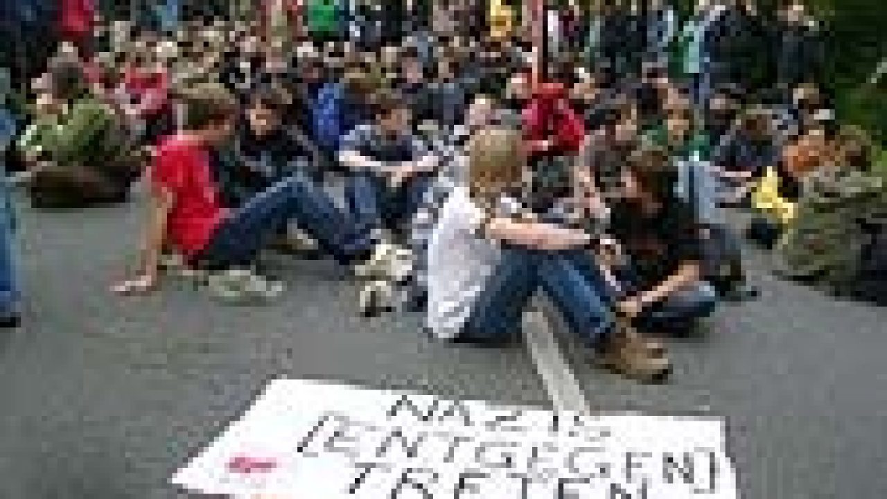 Während der Reden wurden blaue, orangene und andersfarbige Zettel verteilt, auf denen dafür geworben wurde, „mit buntem Widerstand friedlich die braune Einfalt zu blockieren“ – und Gruppen mit den Fahnen in der Farbe des jeweiligen Flugblatts zu folgen. Das Risiko sei gering, denn „die gewaltlose Teilnahme an einer Sitzblockade“ könne von der Polizei nur als eine Ordnungswidrigkeit behandelt werden, nicht als Straftat. Und zwei Jahre zuvor, 2005 hatten Bürger schon einmal einen rechten Versammlungsplatz blockiert, „dafür gab es bekanntermaßen kein Bußgeld, sondern den Preis für Zivilcourage der Stadt Jena“. Prompt leerten sich die Auewiesen und fast ausnahmslos alle Besucher beteiligten sich an Blockaden mehrerer zentraler Kreuzungen in der Stadt – schneller, als die Polizei reagieren konnte – oder wollte. Denn zugleich verteilten auch Polizeibeamte Flugblätter, auf denen sie einerseits betonte, Neutralität wahren zu müssen, aber auch darum bat „Versuchen Sie Protestformen zu finden, die friedfertig sind und die der Polizei eine Chance geben, sich zurück zu halten