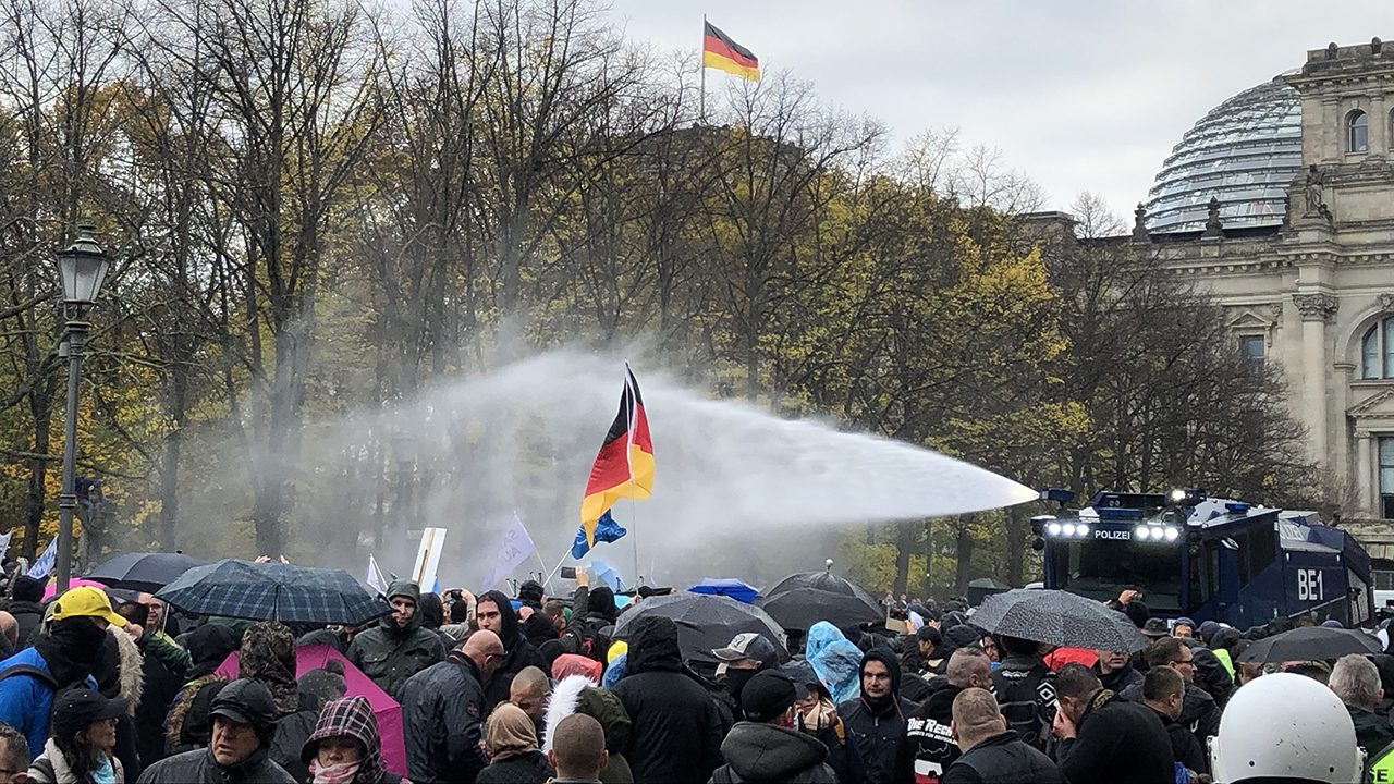 Die Polizei berichtet, dass sie von Demonstrant*innen mit Flaschen, Steinen und Böllern beworfen, sowie mit Pfefferspray angegriffen werde. Einem Tweet der Berliner Polizei zufolge legten „Unbekannte“ brennende Grillanzünder auf den Reifen eines Polizeiautos in der Ebertstraße, der Querstraße zum Brandenburger Tor. Diese konnten rechtzeitig entfernt werden. Anders als in Leipzig am 7. November 2020 oder bei vergangenen „Querdenken“-Demos in Berlin im August reagiert die Polizei mit härteren Maßnahmen als nur Durchsagen: Über die nächsten Stunden kommen mehrere Wasserwerfen fast andauernd zum Einsatz: Zuerst mit „Sprühnebel“, später mit reißenden Strömen kaltem Wasser.