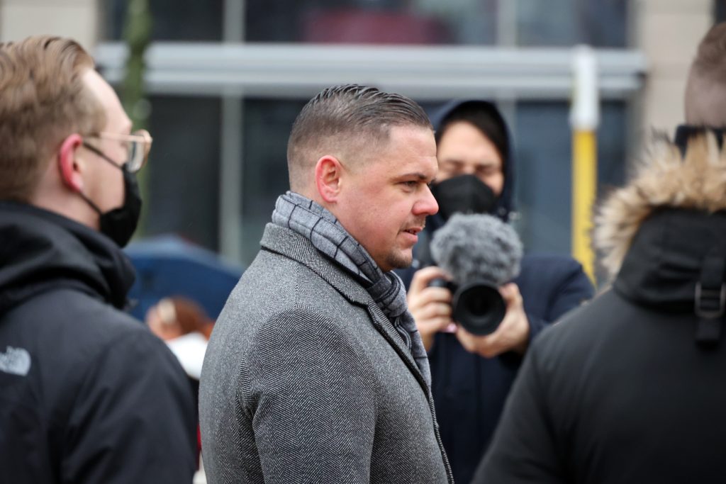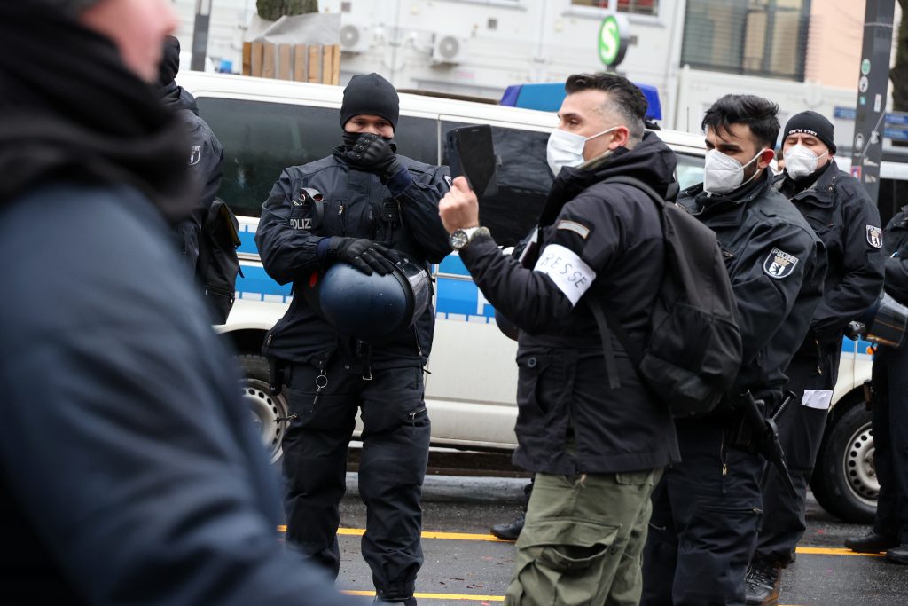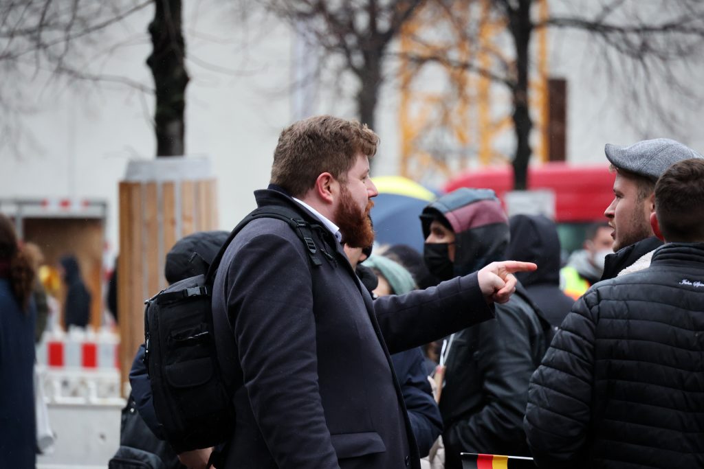 Einige Funktionäre der AfD waren ebenfalls vor Ort – wie die Bundestagesabgeordneten Hannes Gnauck, Petr Bystron und Carsten Hilse, umringt von einem teils aggressiven Sicherheitspersonal, das die Konfrontation mit Journalist:innen suchte. Auch Eric Graziani, Kopf der rechtsextremen Splittergruppe „Patriotic Opposition Europe“, der in letzter Zeit mehrere sogenannte „Montagsspaziergänge“ gegen Coronamaßnahmen in Berlin-Mitte angemeldet und angeführt hat, war anwesend – doch heute mit Kamera und „Presse“-Binde am Arm.