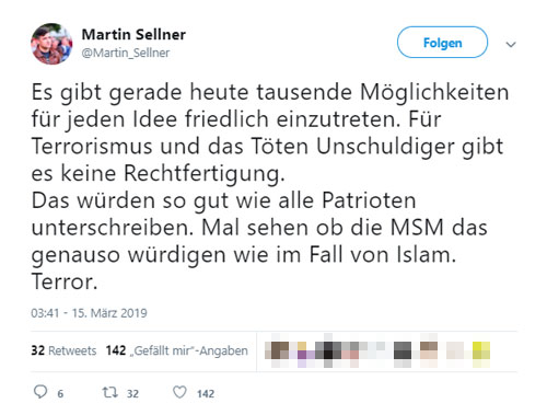 Natürlich äußert sich Sellner – wie bereits in den vergangenen Tagen – auch inhaltlich zum Vorgehen. Dabei ist auffällig, dass alle Distanzierungen sich auf die Gewalt der Tat beziehen, nicht aber auf die islamfeindlichen und demokratiefeindlichen Inhalte, die der rechtsterroristische Täter damit verbreiten wollte – und die die IB teilt. Es ist der krampfhafte Versuch eines Umgangs mit der Tatsache, dass die „Identitären“ zwar seit ihrer Gründung von sich behaupten, Gewalt abzulehnen und nur politisch für ein rassistisch-völkisches Gesellschafskonzept zu streiten, aber zugleich die, die sie als „Gegner*innen“ wahrnehmen, zu bedrohen, zu beleidigen und ihre Daten zu veröffentlichen (vgl. BTN). Dies wiederum verstehen Sympathisant*innen sehr wohl als Aufruf zu Gewalt, wenn auch nicht alle Gewalt so mörderische Folgen hat wie der rechtsterroristischen Anschlag von Christchurch.