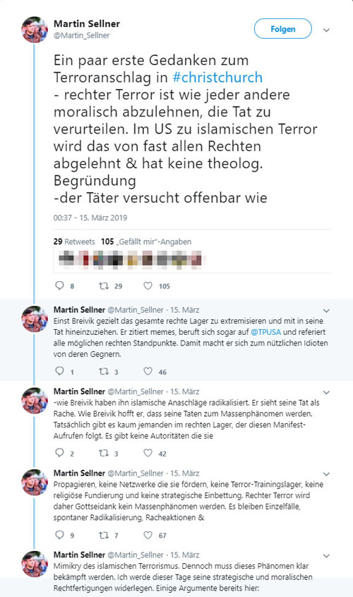 Argumentative Schwurbeligkeit angesichts der Ermordung von 50 Menschen im Namen des „Großen Austausches“ ließ sich bereits in den letzten Tagen auf IB-Accounts beobachten. Sellner selbst versuchte es mit der „Einzeltäter“-These und der angesichts zahlreicher rechtsterroristischer Vereinigungen allein in Deutschland recht abenteuerlichen Behauptung, „fast alle Rechten“ würden Terror ablehnen.