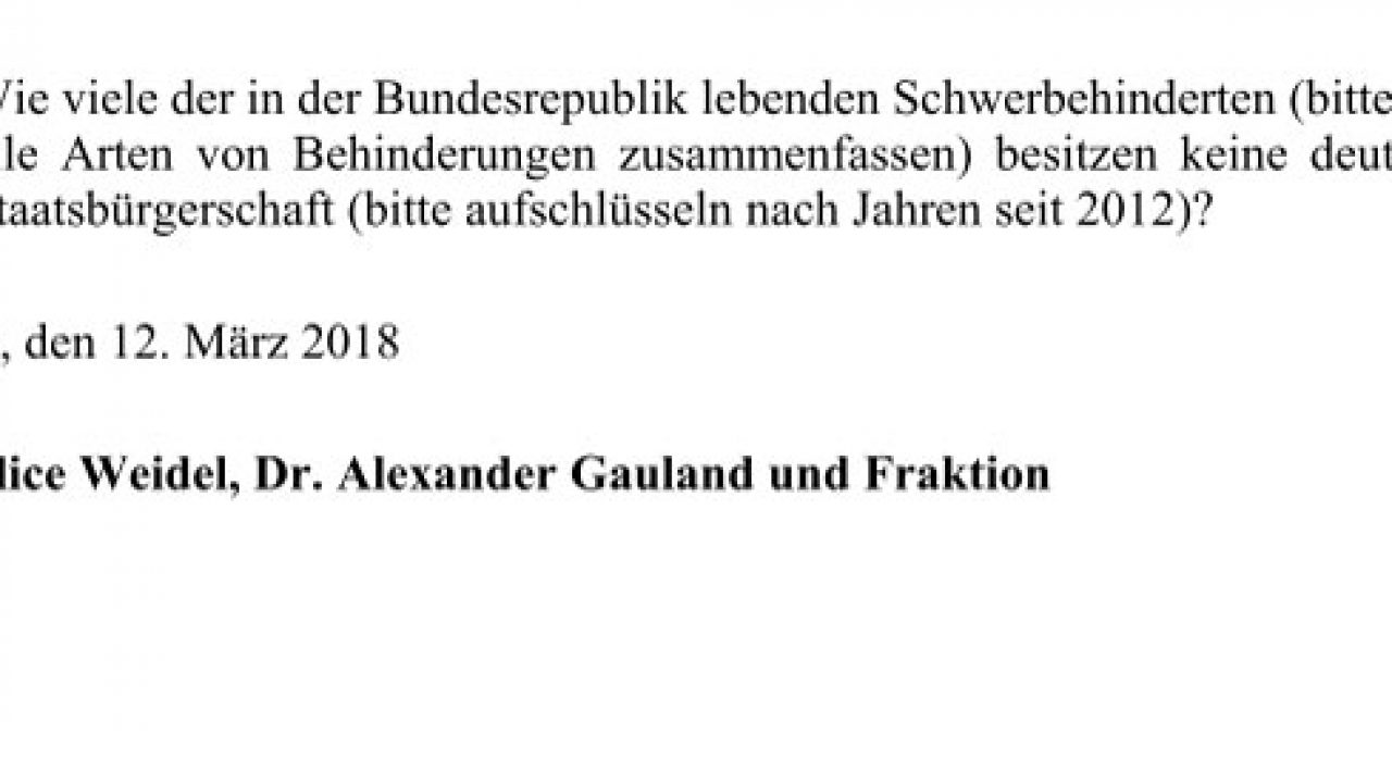 Am 22. März stellte die AfD im Bundestag eine kleine Anfrage, die in aller Deutlichkeit zeigt, welch Geistes Kind die AfD ist: Die Abgeordneten Nicole Höchst, Franziska Gminder, Jürgen Pohl, Verena Hartmann sowie die gesamte AfD-Bundestagsfraktion unter Leitung Alice Weidels und Alexander Gaulands möchten von der Bundesregierung wissen, wie viele Menschen in Deutschland als schwerbehindert gelten, um dann Mutmaßungen über die Auswirkungen „inzestuöser Verhältnisse“ innerhalb Migranten-Familien anzustellen.