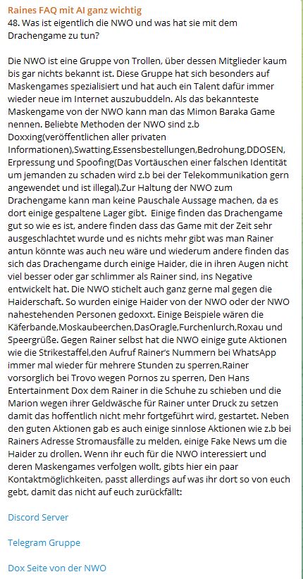 Dann gibt es noch die „NWO“, eine Trollgruppe, die partiell mit der „Drachenlord”-Community verbunden ist, partiell diese aber nicht nur ablehnt, sondern explizit angreift. Populäres Ziel ist aber auch hier Winkler. Die „Haider“ selbst formulieren ihr Verhältnis zur NWO folgendermaßen: