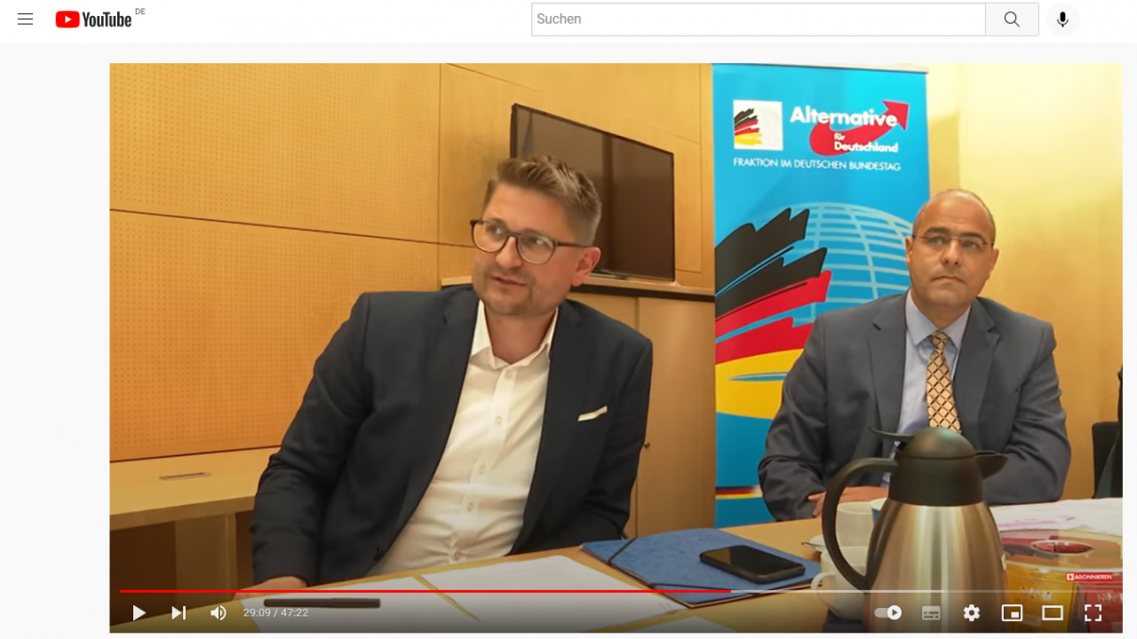 Drei Abgeordnete der AfD-Fraktion greifen die Schilderungen der Bürger*innen auf und werben in kurzen Statements für die Vorschläge der Partei. Außerdem werden sie bei einer angeblich nicht gestellten Arbeitssitzung gezeigt. Einer der drei AfD-Politiker ist eben jener Peter Boehringer. Er ist haushaltspolitischer Sprecher der AfD-Bundestagsfraktion und vertritt Verschwörungserzählungen: von der „Neuen Weltordnung”, an der die Eliten arbeiteten, und dem „Großen Austausch”. So schrieb er zum Beispiel 2015 auf seiner Website: „Und alleine nur wegen der laufenden, irreversiblen Umvolkung in der BRD, das heißt des permanenten Austauschs des deutschen Staatsvolks durch zu 98 Prozent illegale Eindringlinge aus weitgehend muslimischen Herkunftsstaaten, ist die heutige, supranationalen Befehlen gehorchende BRD-Führungsclique inzwischen krimineller als die kommunistische der DDR, die ja schon schlimm genug war!“