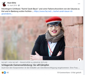 Die feministischen Burschenschaften funktionieren nach sehr ähnlichem Prinzip. Sie spiegeln die Ideale rechtsradikaler Burschenschaften an der Achse des Geschlechts und weisen dadurch auf deren Absurdität, auch in moderateren Formen hin. Sie behalten dabei die formalisierten Hierarchien, die autoritären Ideale und die binären, strikt normierten Geschlechtsideologien (nur eben andersherum). Eine Burschenschaft ohne diese Aspekte hätte nicht mehr viel mit einer Burschenschaft zu tun. Sie wäre einfach nur noch ein Freundeskreis. Vielleicht ist das auch der Grund, aus dem es immer noch keine queere Burschenschaft gibt. Student:innenverbindungen, ob feministisch, weiblich oder männlich brauchen das binäre Geschlecht um zu existieren.