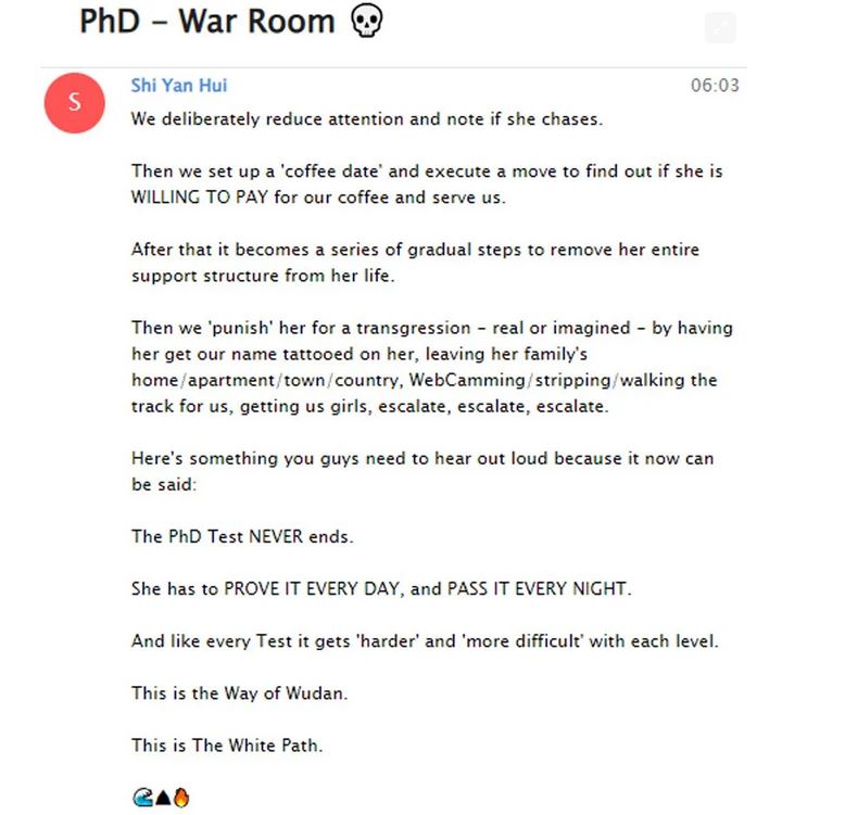 Belltower.News hat Zugang zu mehreren „War Room“-Chatlogs. In diesen beschreiben die Mitglieder von Tates engem Zirkel sehr explizit ihren Umgang mit Frauen: die „PhD“-Methode. Das Kürzel steht für „Pimping Hoes Degree“ – den „Zuhälter-Abschluss“. Über die Techniken und Erfolge tauscht sich der enge Zirkel von Tate in einem eigens angelegten Chatroom aus. Es handelt sich hierbei um eine klassische Loverboy-Masche. Frauen sollen durch Sex, Aufmerksamkeiten, das Versprechen von Ruhm, Erfolg, finanzieller Sicherheit an die Täter gebunden werden. Dies geht regelmäßig mit Aufforderungen einher, den Wohnort zu wechseln oder den Täter zumindest mal zu besuchen. Anschließend folgt emotionale Manipulation: Die Männer sollen „Drama machen“, also emotional aufgeladene Situationen schaffen, und dann Frauen dafür in die Verantwortung ziehen – also Gaslighting.Die Betroffenen sollen beginnen, an sich selbst zu zweifeln und ihre eigenen Gedanken und Handlungen zunehmend in Frage stellen.