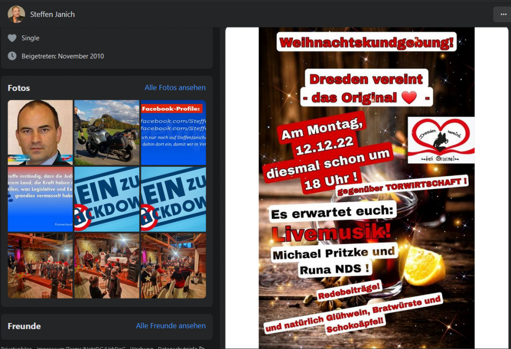 Wenn weiße Männer Gewalttaten begehen, ist die Öffentlichkeit schnell dabei, die Angelegenheit zu individualisieren: „Familiendrama“ oder „psychische Krankheit“ sind gerne verwendete Begriffe. Es ist naheliegend, dass David W. psychisch labil gewesen war; zumindest beschreiben ihn Bekannte als „seltsam, ruhig und etwas wirr“. Sein Social Media-Profil wirkt auf den ersten Blick unauffällig: er teilt Petitionen gegen Massentierhaltung oder Plastikmüll. Die mit „Gefällt mir“ bewerteten Seiten weisen ebenfalls nicht auf eine mörderische Tendenz hin: „Recycling Guru“, „Ärzte gegen Tierversuche“, ein Techno-Künstler. Einige Facebook-Freund*innen von David W. jedoch brechen mit dem Bild des Gutmenschen: sie haben schwarz-weiß-rote Flaggen im Profilbild, teilen Sharepics mit nationalistischen Inhalten und verbreiten Desinformation über den Corona-Impfstoff. Unter den Freunden ist auch der sächsische AfD-Politiker Steffen Janich. Janich bewirbt eine Veranstaltung, auf der die rechtsradikale Rapperin Runa auftreten soll; sie ist Teil des der „Identitären Bewegung“ nahestehenden Plattenlabels „Neuer Deutscher Standard“. Der Janich ist Polizist, ist vehementer Gegner von Corona-Schutzmaßnahmen, ruft zu der jährlich stattfindenden Neonazi-Demo zum 13. Februar in Dresden auf. Er wurde wegen der Organisation von nicht angemeldeten Demonstrationen 2020 vom Dienst suspendiert.