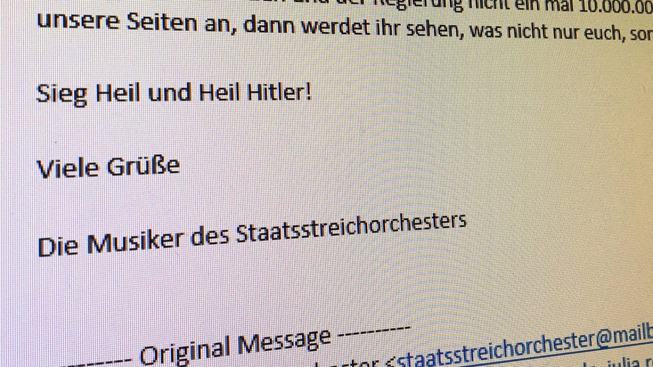 „Wir werden nicht nur dafür sorgen, dass sich kein jüdischer Untermensch mehr in Deutschland und weltweit sicher fühlt, sondern Prämien für jeden toten Juden ausloben […] Sieg Heil und Heil Hitler! Mit freundlichen Grüßen Die Musiker des Staatsstreichorchesters.“ (Mail vom 23. Januar 2019)