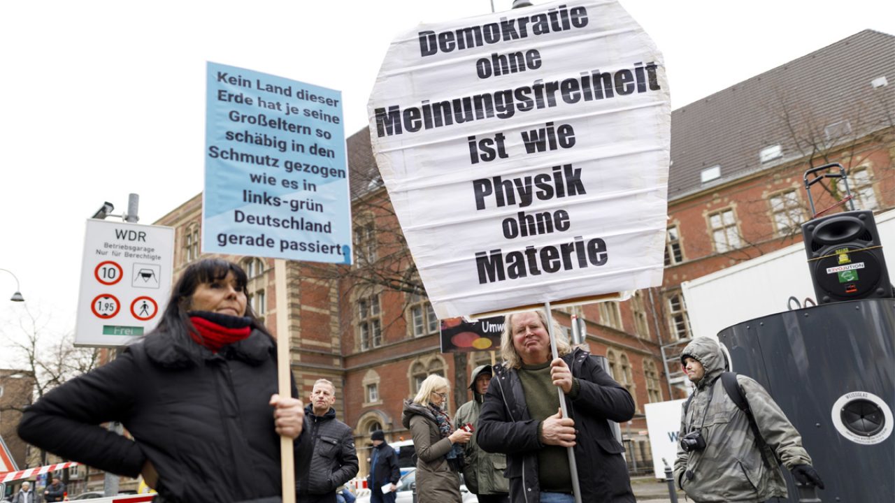 Vor dem WDR-Hauptgebäude posierte dann nur eine ältere Frau mit Transparent, die bereits am 29.12.2019 dabei war. Als eine Journalistin Fotos machen wollte, stürmte sie auf die Journalistin zu und anschließend zur Polizei. Die vermochte der wackeren Freiheitsheldin nicht weiter zu helfen.