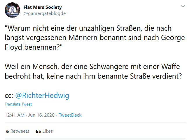 Auch Accounts, die sich als Gamergater verstehen, formulieren auf Twitter ein einseitiges Bild der Ausschreitungen. Neben Tweets, in denen Sympathisant*innen von BLM belächelt, oder vermeintliche postdemokratische Zustände identifiziert werden, konstruieren sie ein kriminelles Bild von George Floyd und Black Lives Matter. Unter dem Hashtag GamerGate versammeln sich seit 2014 vor allem männliche Gamer, die sich gegen eine vermeintliche „politische Vereinnahmung“ von Videospielen stellen und sich in ihrem Selbstverständnis für einen ethischeren Games-Journalismus aussprechen.