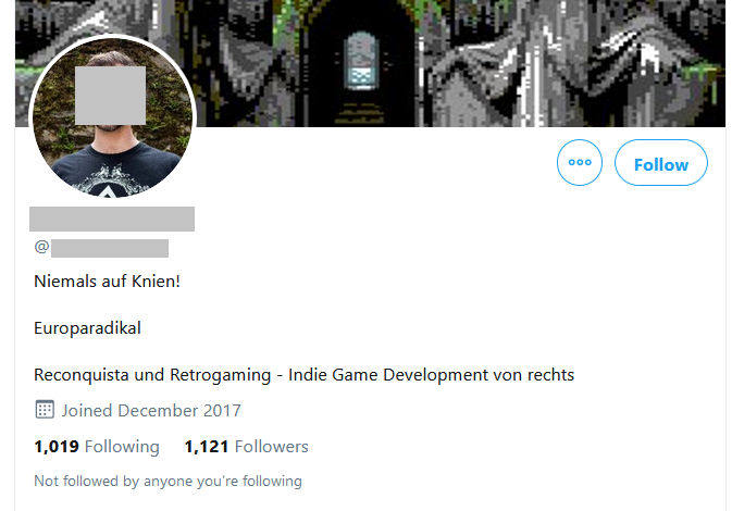 Ähnliche Narrative werden auch von der rechten Gamer*innen-Bubble auf Twitter verbreitet. Zum Beispiel von einem Nutzer aus dem Umfeld der sogenannten „Identitären Bewegung“, der sich selbst als Indie Game Developer von rechts beschreibt. Tweets und Videos der selbsternannten Bewegung werden geteilt und Phrasen wie „Niemals auf Knien“ oder „#BlackCrimesMatter“ verbreitet.