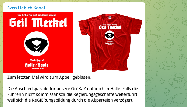 Zu den aktivsten Bewerbern der Demonstration gehört der stadtbekannte Neonazi-Provokateur Sven Liebich, der mit obsessiver Regelmäßigkeit Demonstrationen gegen alles Mögliche in Halle organisiert. Liebich, zu dessen Demo-Outfit in der Regel ein „Ungeimpft“-Judenstern sowie ein Exemplar vom Tagebuch Anne Franks gehört, schreibt etwa zum Tag der Deutschen Einheit auf Telegram: „Zum letzten Mal wird zum Appell geblasen…Die Abschiedsparade für unsere GröKaZ (Anm. d. Red.: „Größte Kanzlerin aller Zeiten“) natürlich in Halle. Falls die Führerin nicht kommissarisch die Regierungsgeschäfte weiterführt, weil sich die ReGIERungsbildung durch die Altparteien verzögert.“