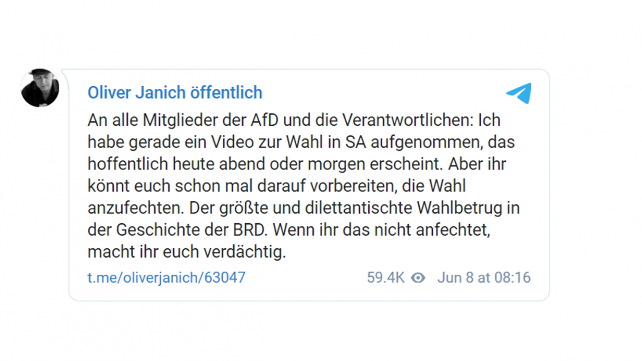 [Beliebt bis Anfang Juni 2021, doch schlecht gealtert, seit täglich Lockerungen erfolgen und die gesellschaftliche Normalität mit sinkenden Inzidenzen zurückkehrt]. - Wahlbetrug als Druckmittel in die eigene Szene: Der verschwörungsideologische YouTuber Oliver Janich schreibt in Richtung AfD: “An alle Mitglieder der AfD und die Verantwortlichen: (…) Der größte und diletantischste Wahlbetrug in der Geschichte der BRD. Wenn ihr das nicht anfechtet, macht ihr euch verdächtig.”