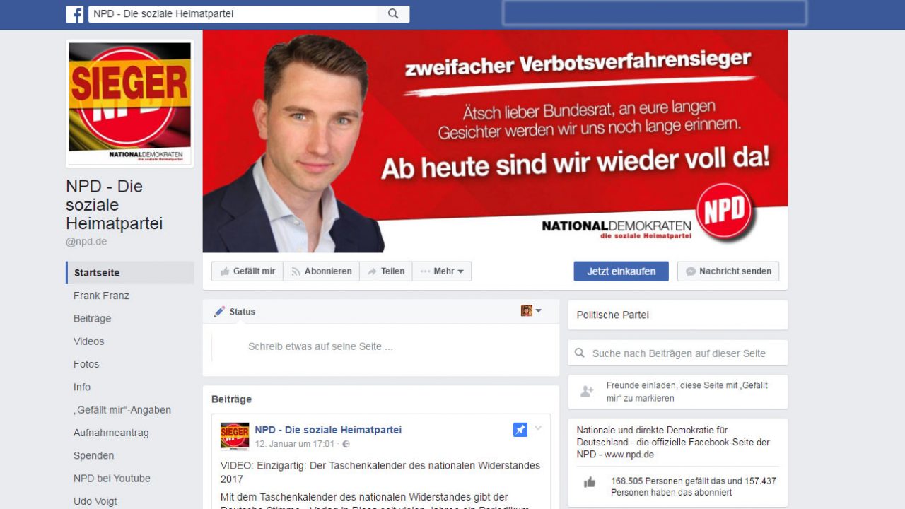 Und die NPD feiert auf Facebook: „Der deutsche #Bundesrat hat auch den zweiten Versuch, die #NPD zu verbieten, verloren.Die Nationaldemokraten sind nun die einzige höchstrichterlich bestätigte Partei in Deutschland.“