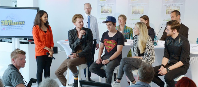 Pressekonferenz zu 361 Grad Respekt in Berlin: Internet-Berühmtheiten ApeCrime und LeFloid im Gesprächmit Carolin Niemczyk und Daniel Grunenberg von der Band „Glasperlenspiel“. Quelle: YouTube “361 Grad Respekt”