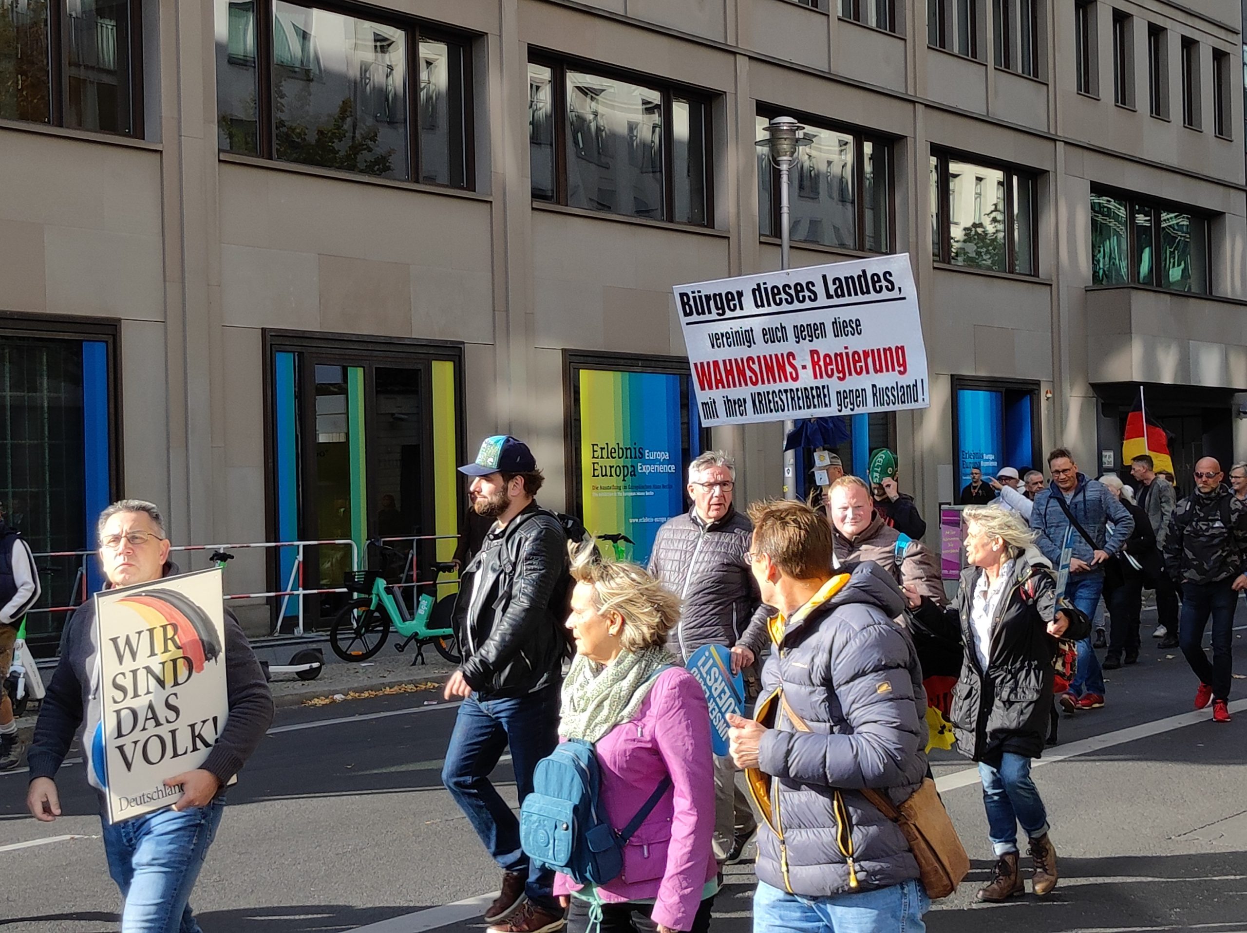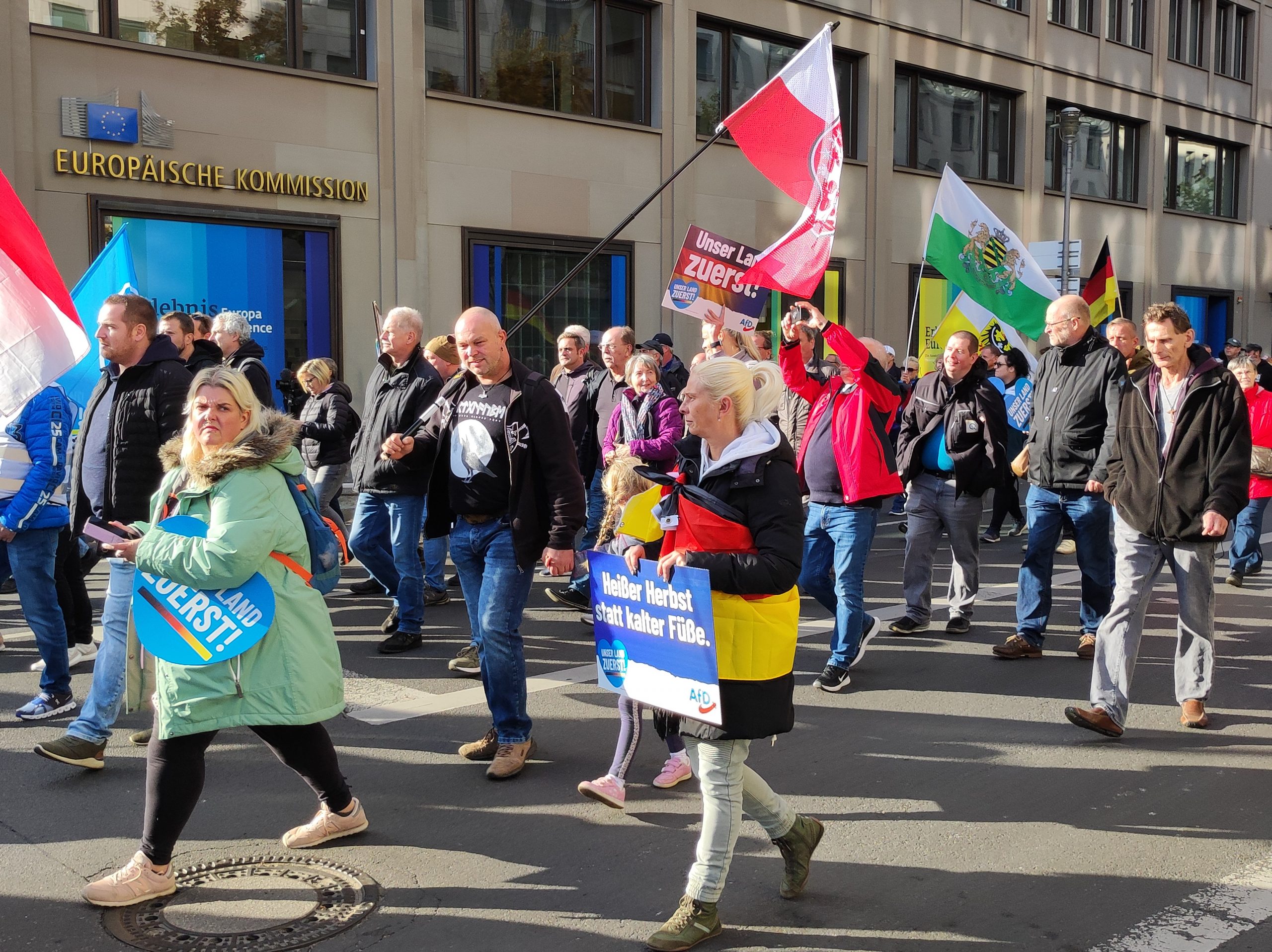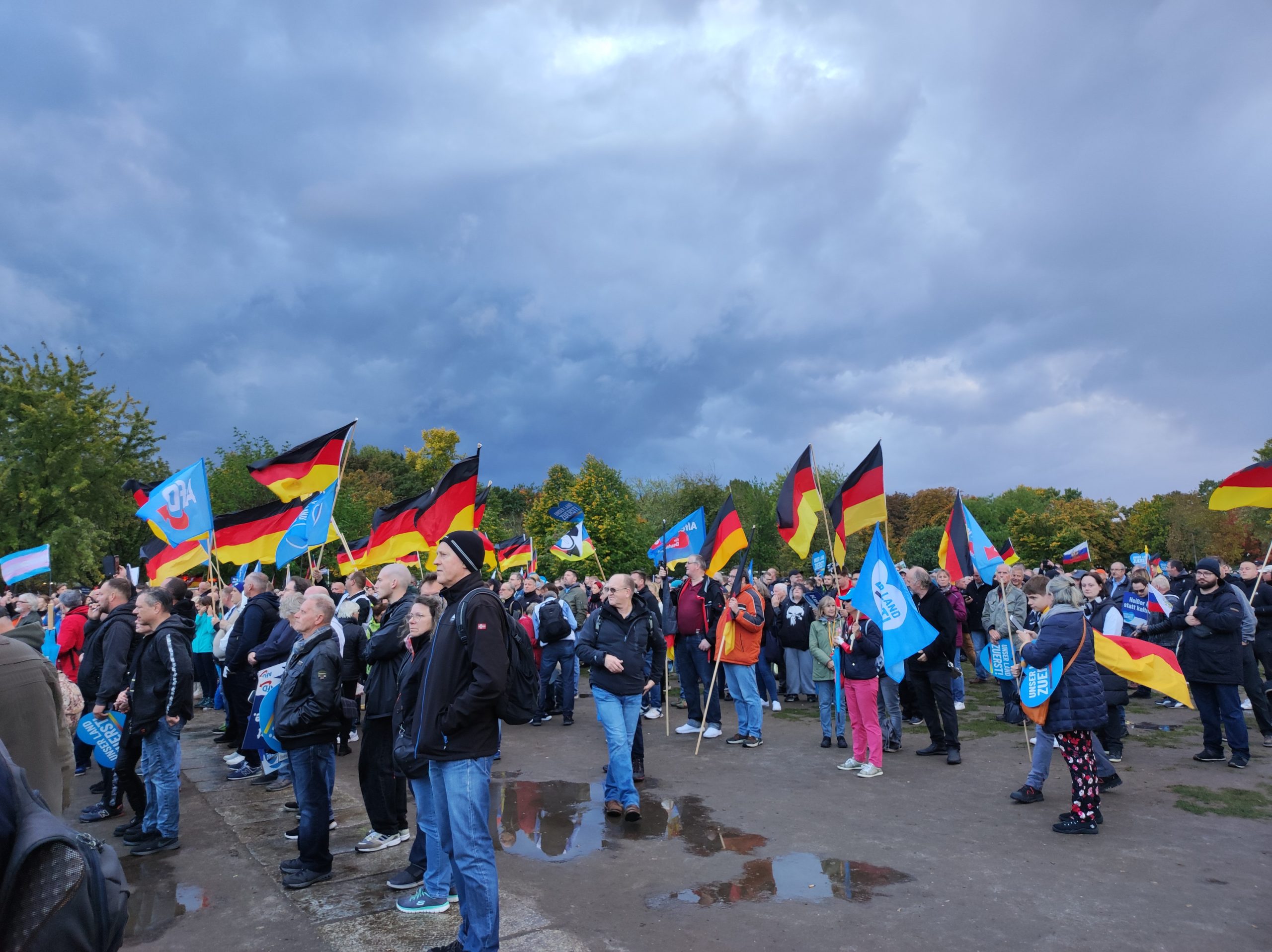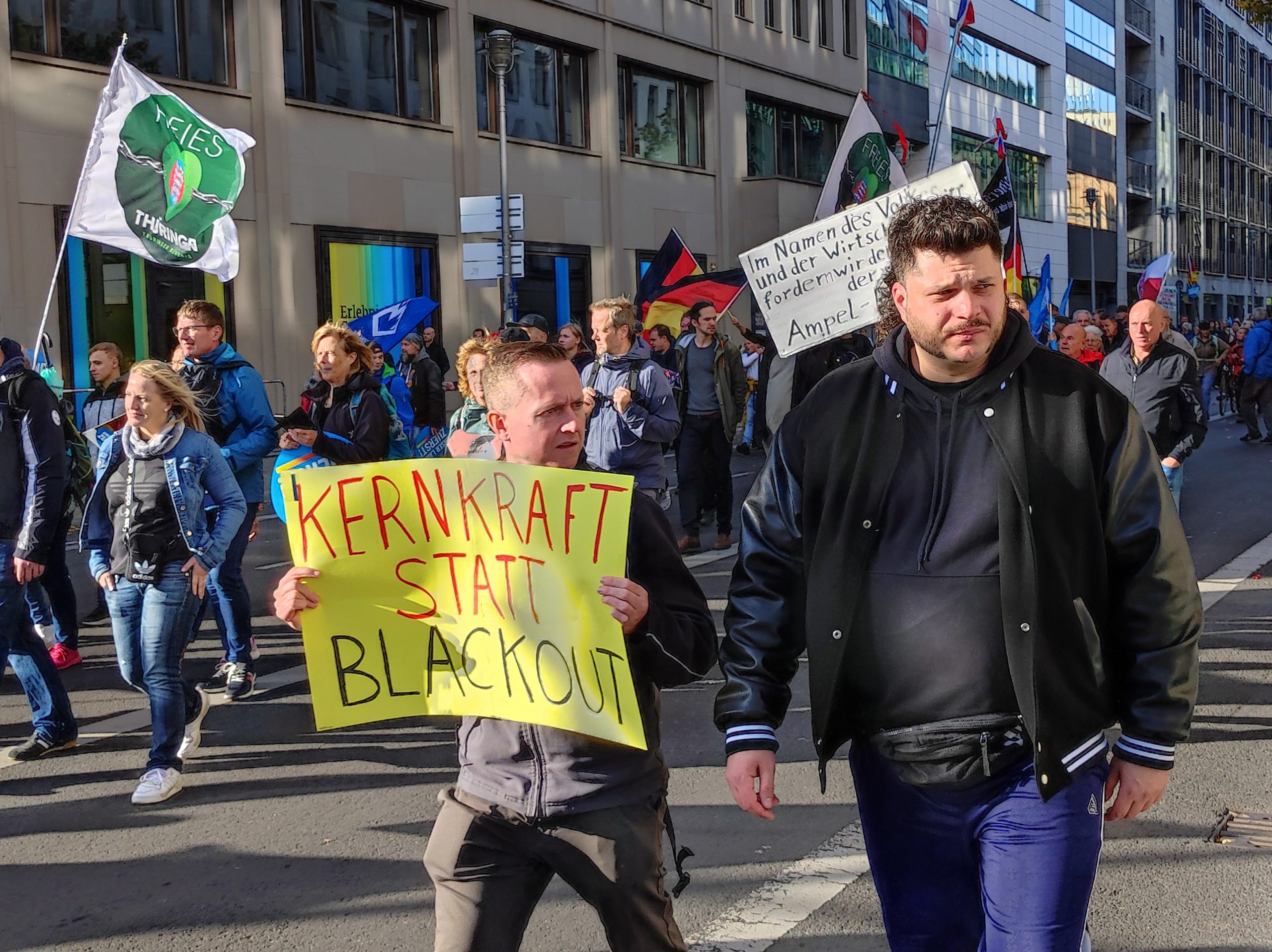 Die Demonstrations-Teilnehmenden tragen rechtsextreme Marken von Thor Steinar bis Peripetie. Viele Wikingerbärte und nordische Symboliken sind zu sehen, gemischt mit Rockerkutten. Viele tragen (wieder) Glatzen, und viele tragen sehr akkurate Scheitel – oder eben geflochtene Zöpfe bei den Damen, bei den wilden in feurigem Rot. Daneben viele Shirts mit Deutschland-Aufdrucken, natürlich in Fraktur, und AfD-Fanbekleidung. Rechtsextreme Flaggen werden getragen – Reichsflaggen, Wirmer-Flaggen, Flaggen mit „interessanten“ Sprüchen (erneut in Fraktur) wie „Hüte Dich vor Sturm und Wind – und Ossis, die in Rage sind“, „Widerstand lässt sich nicht verbieten“ oder „Freiheit ist nicht rechts“ (ja, verwirrend, gemeint war aber wohl, dass für ‚Freiheit‘ einzutreten nicht rechtsextrem sei). Und laufen dazwischen Menschen, die wie freundlich-bürgerliche Nachbarn aussehen, tragen sie Schilder wie „Grüne an die Ostfront“ oder „Ihr seid die Staatsfeinde“ (mit Fotos von Baerbock, Habeck und Scholz) und zeigen damit ihre Verachtung für politische Gegner*innen.