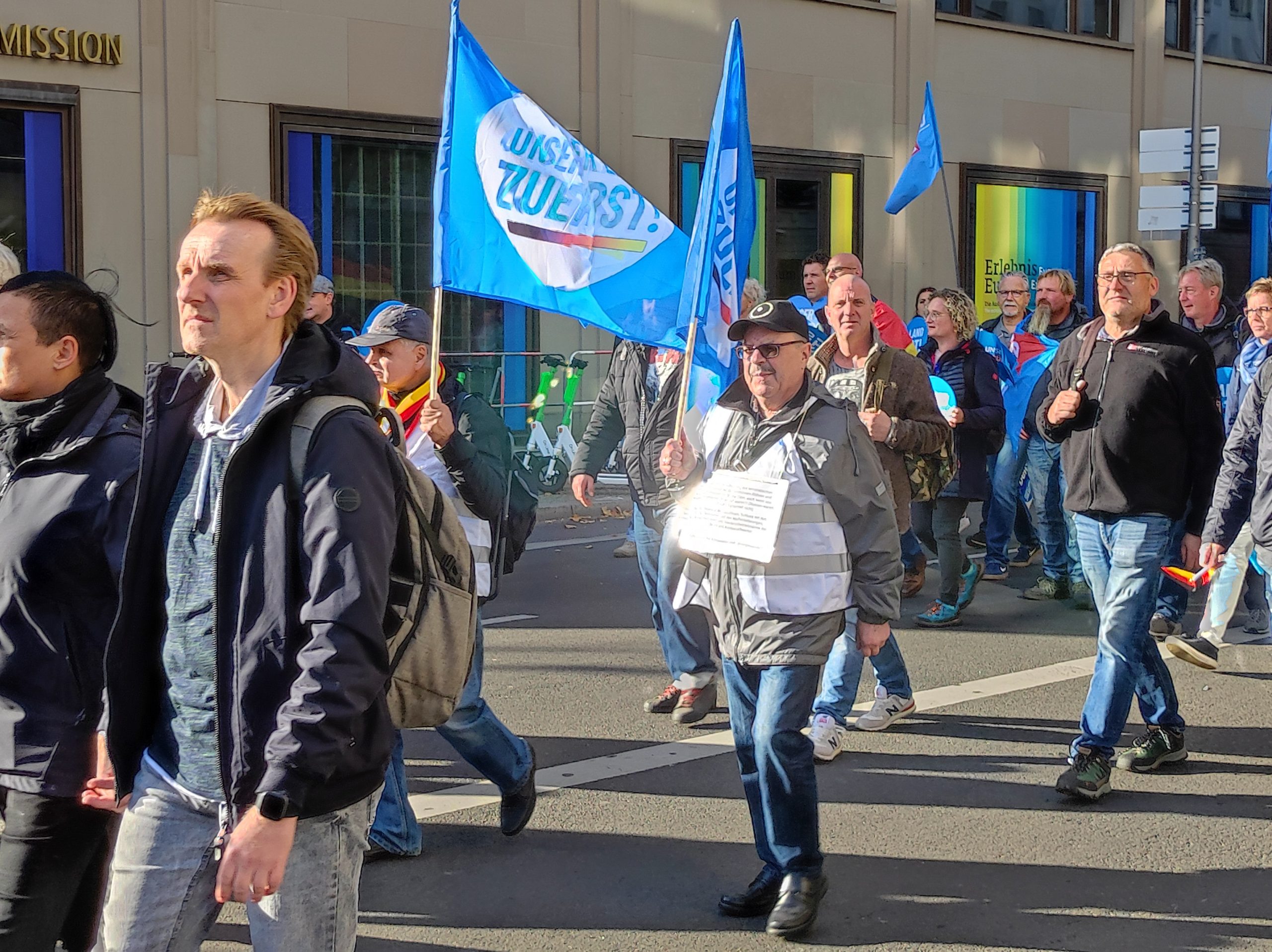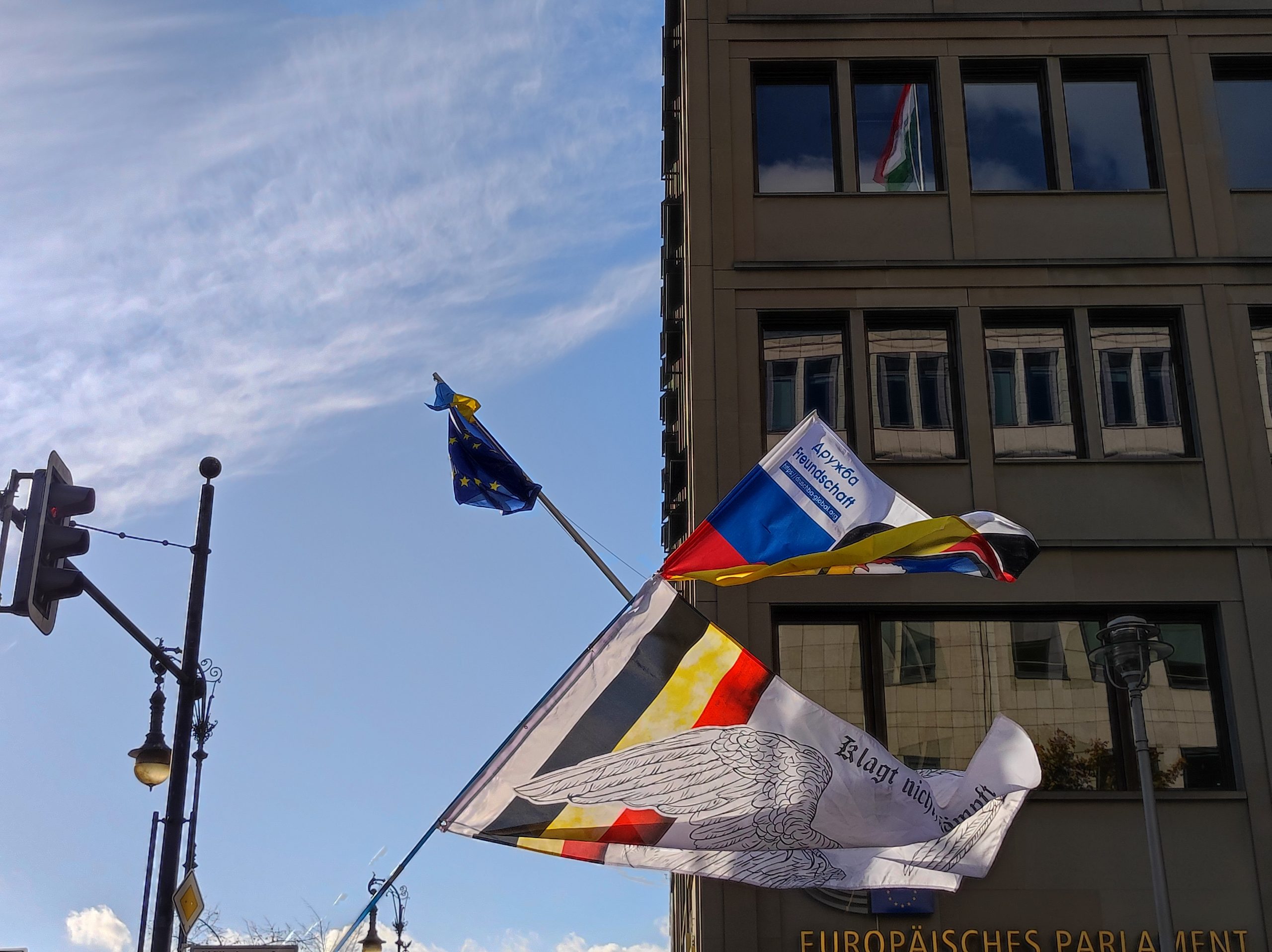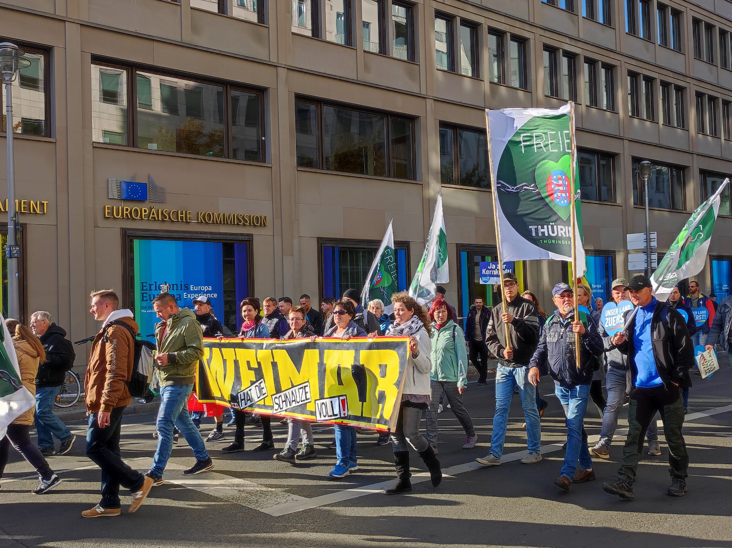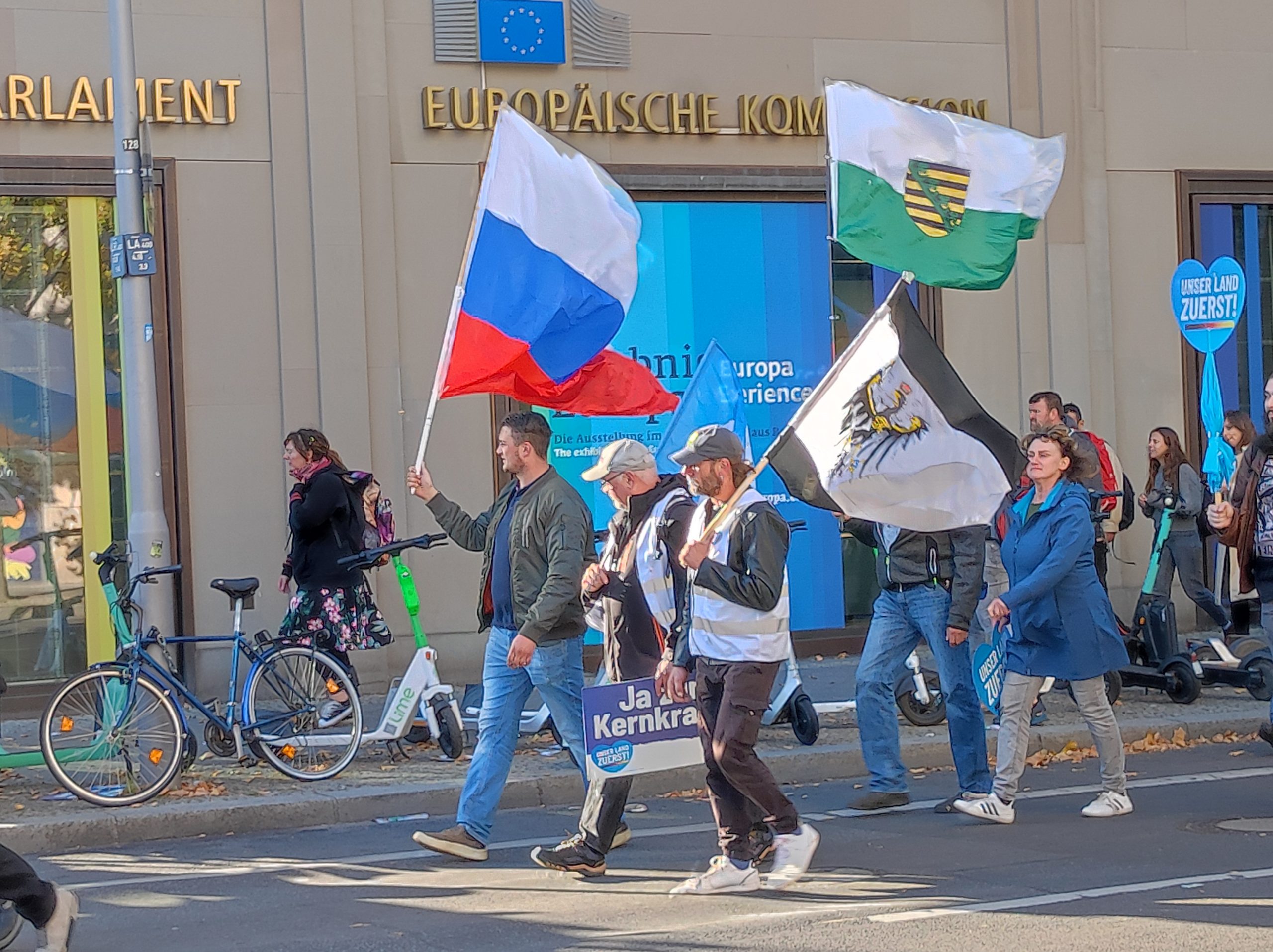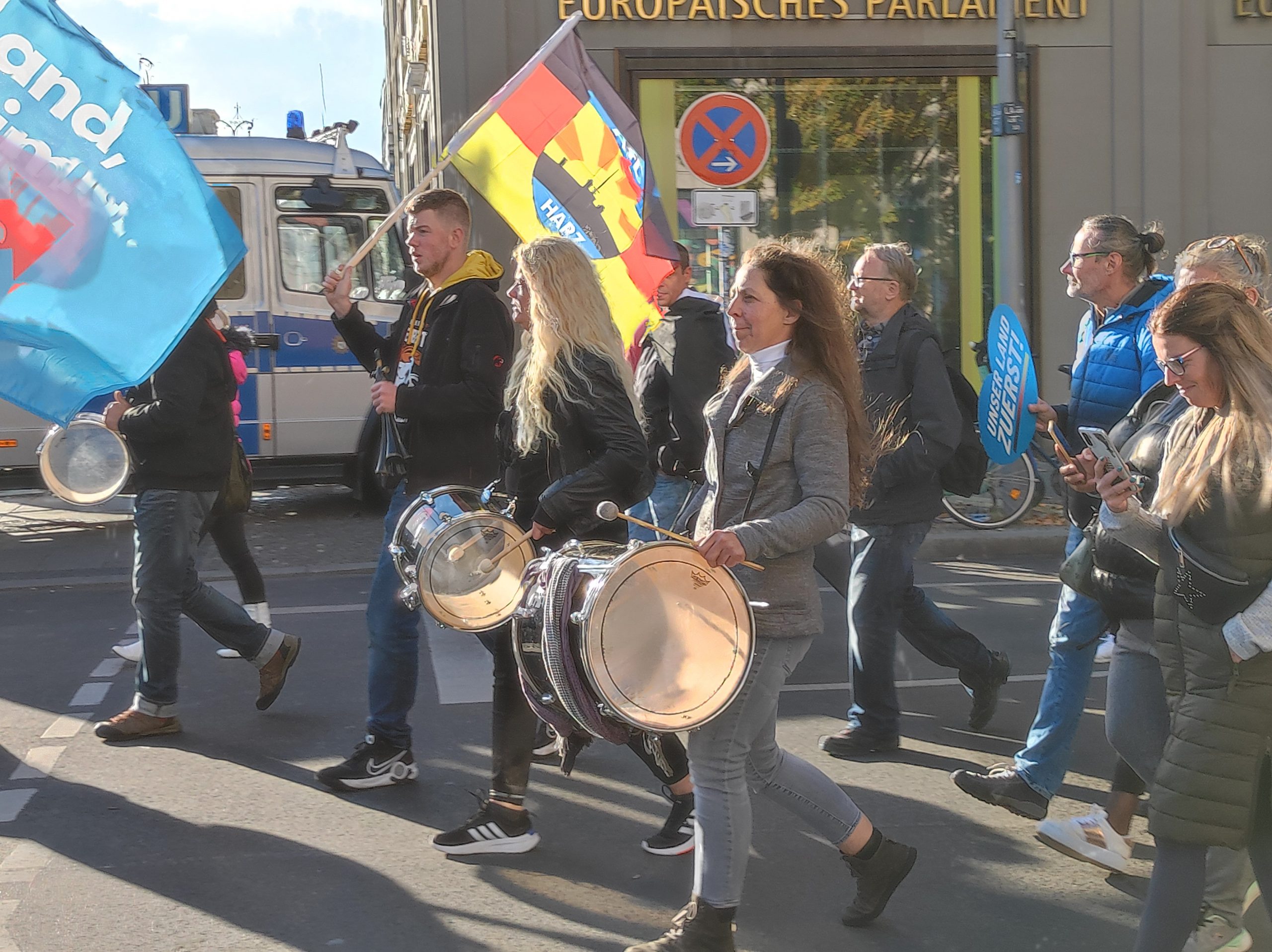 Die Demonstrations-Teilnehmenden tragen rechtsextreme Marken von Thor Steinar bis Peripetie. Viele Wikingerbärte und nordische Symboliken sind zu sehen, gemischt mit Rockerkutten. Viele tragen (wieder) Glatzen, und viele tragen sehr akkurate Scheitel – oder eben geflochtene Zöpfe bei den Damen, bei den wilden in feurigem Rot. Daneben viele Shirts mit Deutschland-Aufdrucken, natürlich in Fraktur, und AfD-Fanbekleidung. Rechtsextreme Flaggen werden getragen – Reichsflaggen, Wirmer-Flaggen, Flaggen mit „interessanten“ Sprüchen (erneut in Fraktur) wie „Hüte Dich vor Sturm und Wind – und Ossis, die in Rage sind“, „Widerstand lässt sich nicht verbieten“ oder „Freiheit ist nicht rechts“ (ja, verwirrend, gemeint war aber wohl, dass für ‚Freiheit‘ einzutreten nicht rechtsextrem sei). Und laufen dazwischen Menschen, die wie freundlich-bürgerliche Nachbarn aussehen, tragen sie Schilder wie „Grüne an die Ostfront“ oder „Ihr seid die Staatsfeinde“ (mit Fotos von Baerbock, Habeck und Scholz) und zeigen damit ihre Verachtung für politische Gegner*innen.