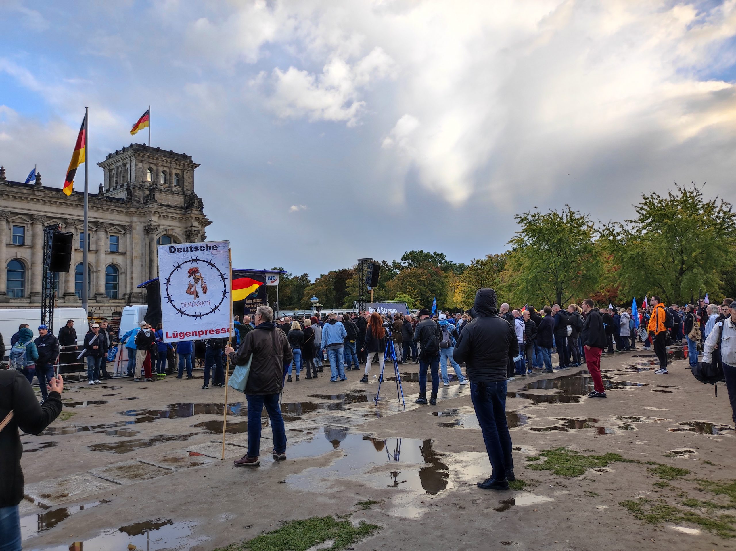 Die Wiese vor dem Reichstag, wo die AfD-Demonstration wieder enden soll, hat sich inzwischen in eine Matschgrube verwandelt. Die Deko der AfD-Bühne flattert stark, und während einer murrt, wie nass er ist, sagt der Teilnehmer daneben, man sei ja wohl nicht verweichlicht und so ein bisschen Regen mache doch wohl einem wahren Patrioten nichts aus!