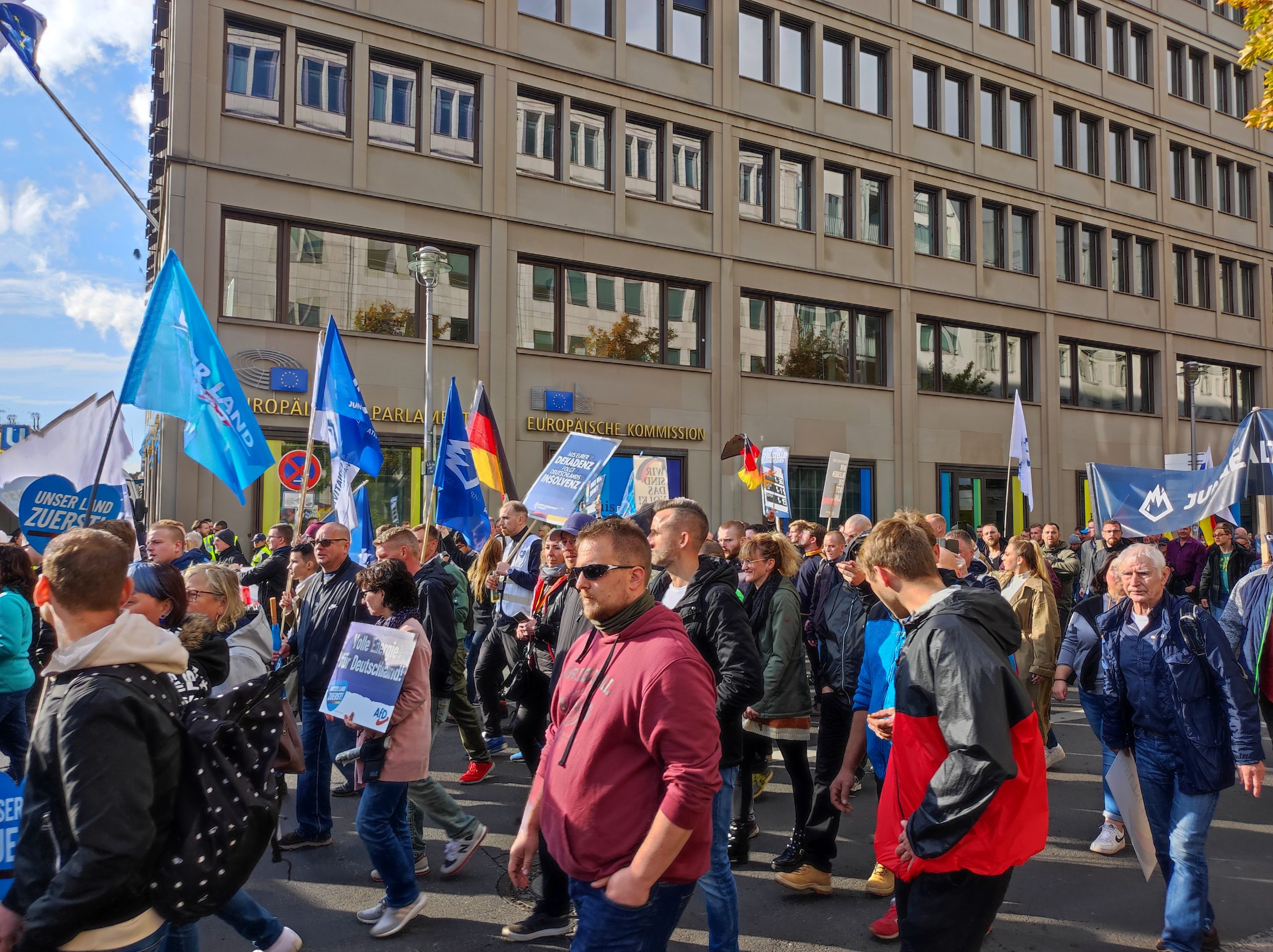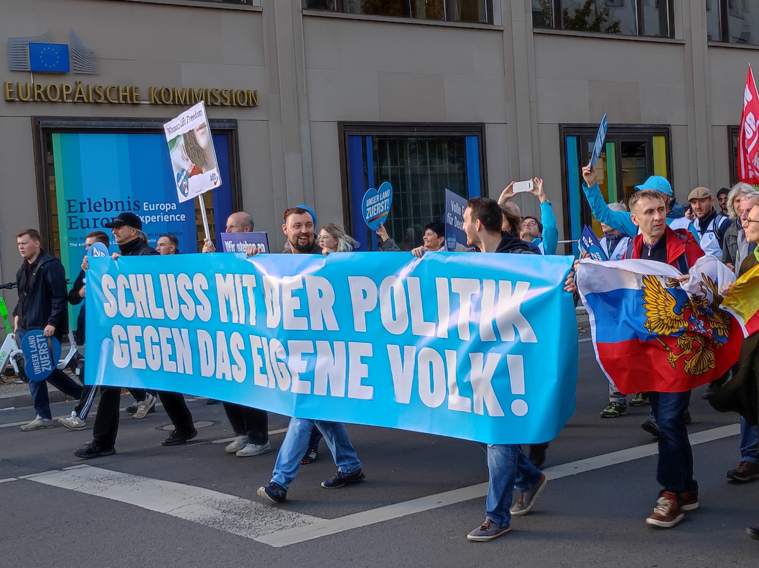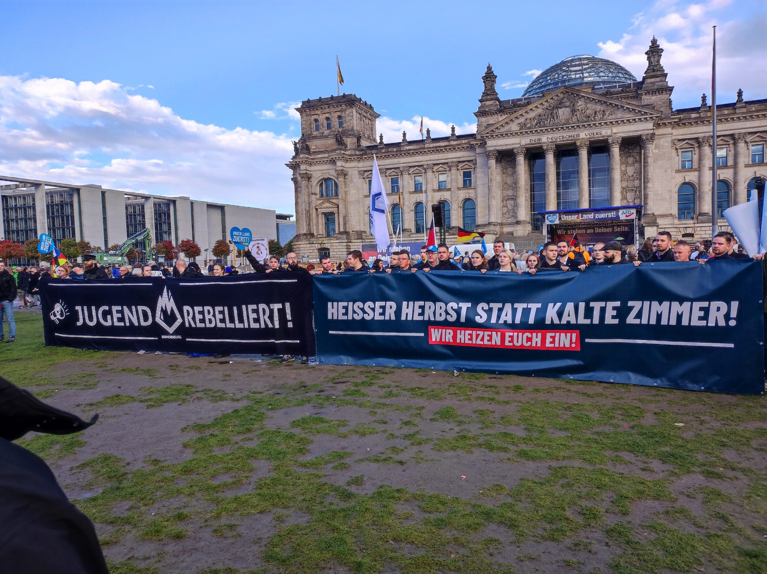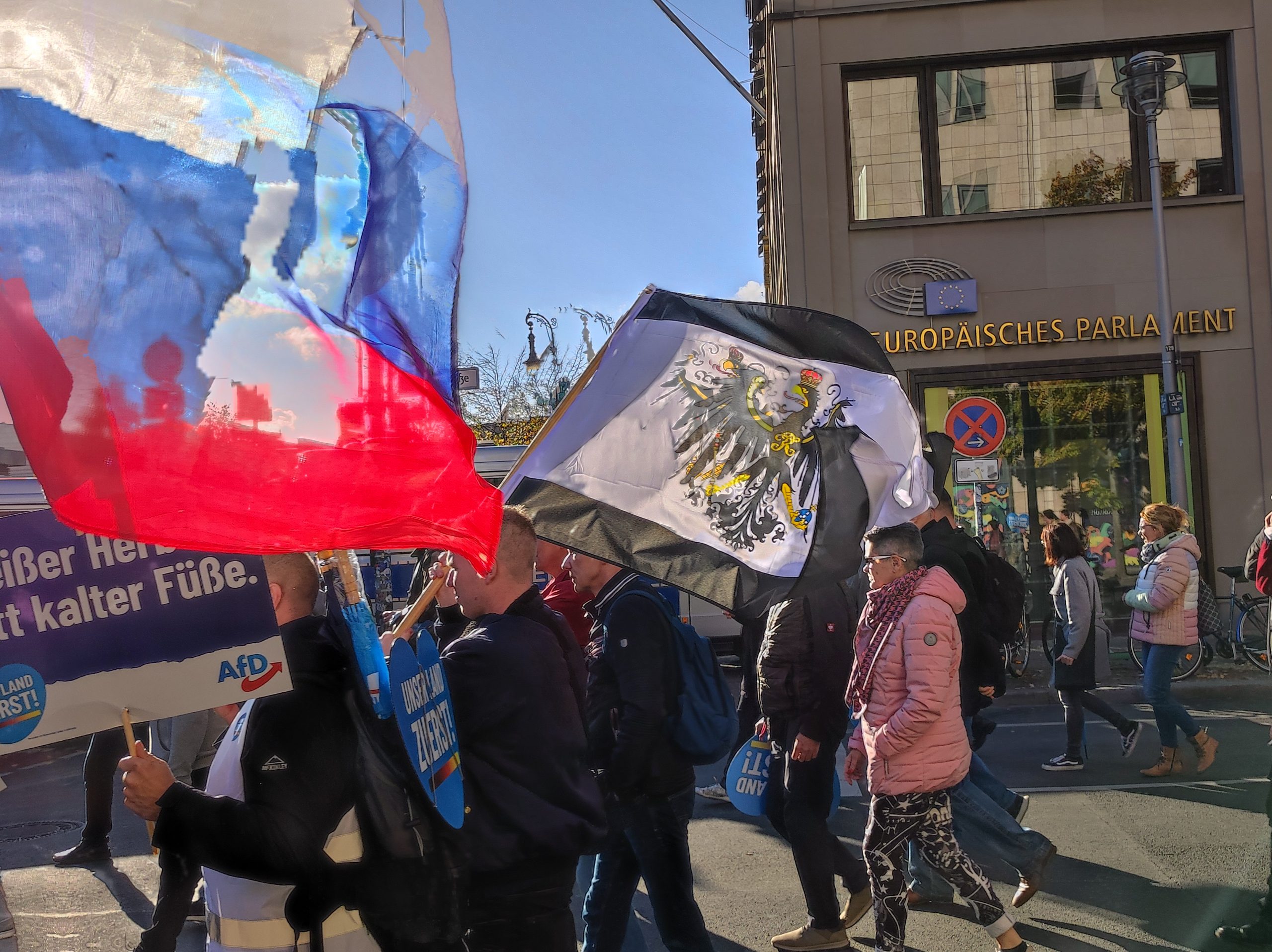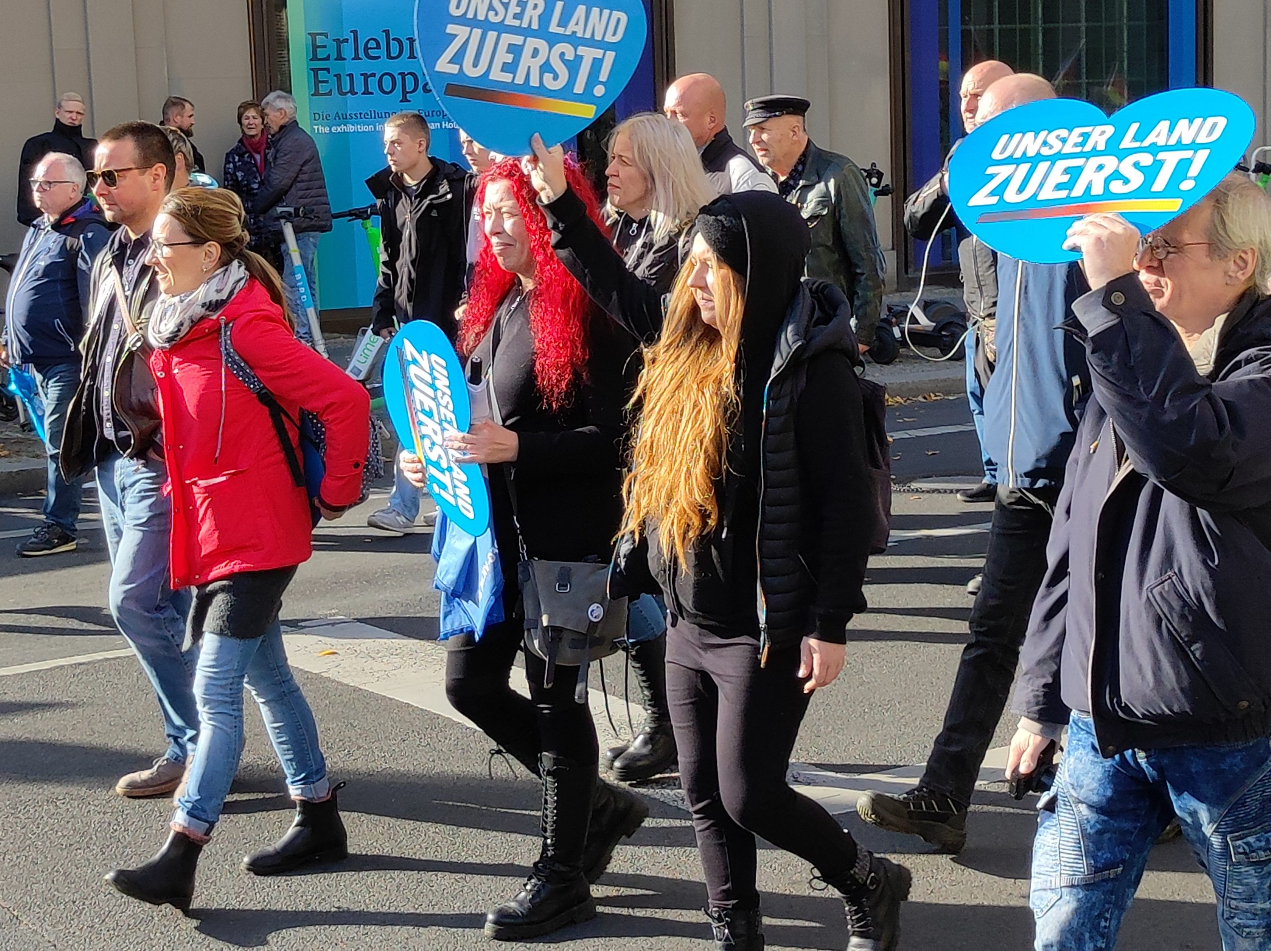 Es gibt nicht viel Positives zu berichten von der AfD-Herbstdemonstration in Berlin, am 08.10.2022. Die rechtsradikale Partei konnte ihre Auftaktkundgebung auf der Wiese vor dem Reichstag abhalten, dann durch das Berliner Regierungsviertel „spazieren“ und wieder vor dem Reichstag enden und dabei sich selbst feiern, nach dem Motto „Unser Land zuerst“ und mit viel AfD-Herzchen-Merchandise. Es war eine Feier der eigenen Existenz, mehr war es nicht, denn als ‚Inhalte‘ gab es nur die üblichen rechtsradikalen Talking Points (Hass auf die Regierung, Pressefeindlichkeit, Hass auf Gendern, Russlandliebe, Hass auf Geflüchtete, ja zu Kernkraft, schlechte Wortspiele mit heiß (Herbst) und kalt (Heizung)). Aber weniger war es auch nicht. Mit rund 10.000 Teilnehmenden wurden die anvisierten und angemeldeten 4.000 Anhänger*innen weit übertroffen. Und das trotz Zugausfall in Norddeutschland, was schon vor Demonstrationsbeginn zu wilden Verschwörungsfantasien in AfD-Kreisen führte, die auch auf der Abschlusskundgebung der AfD noch raunend angebracht wurde, warum man nicht noch mehr „Volk“ wäre.
