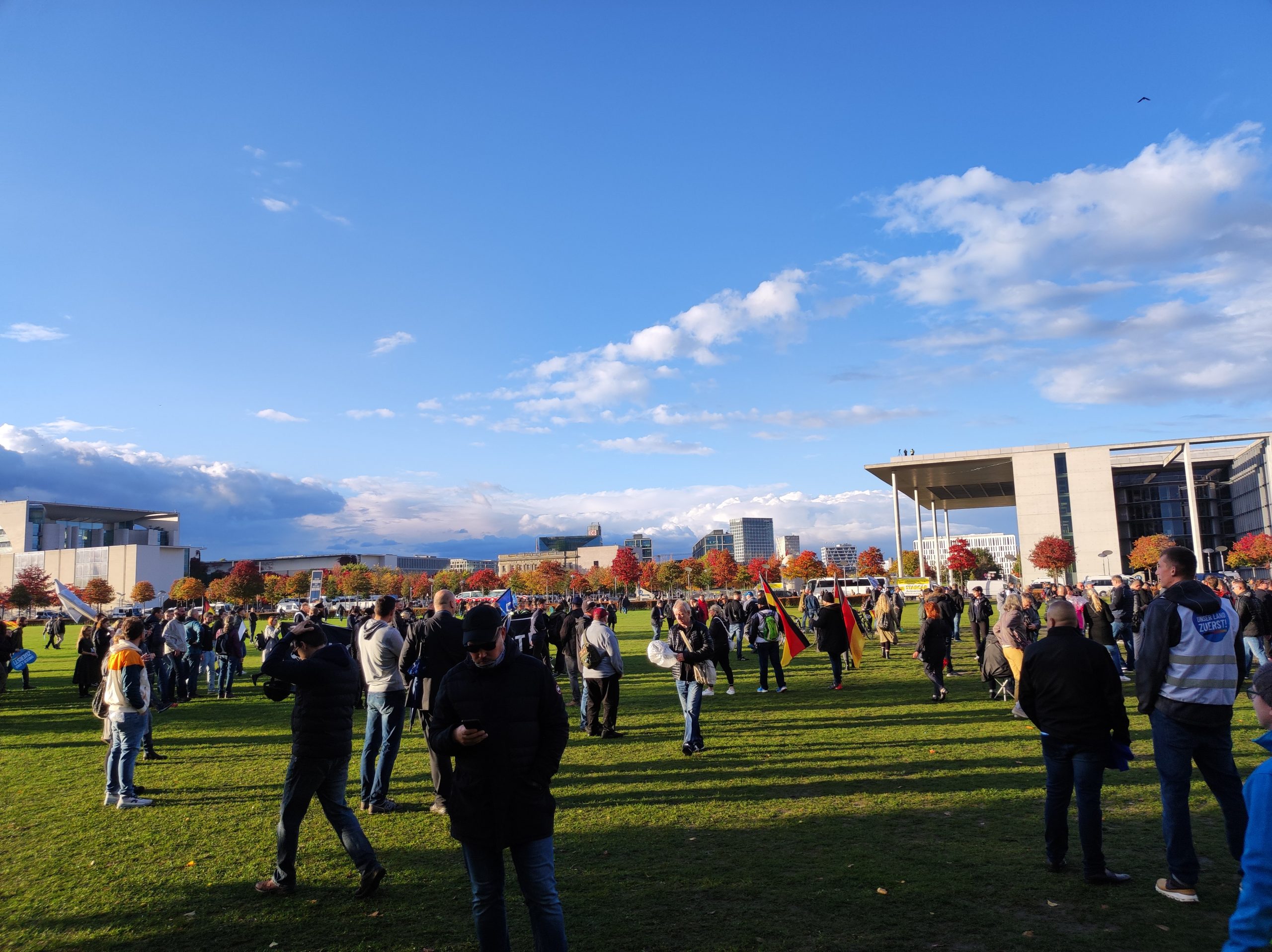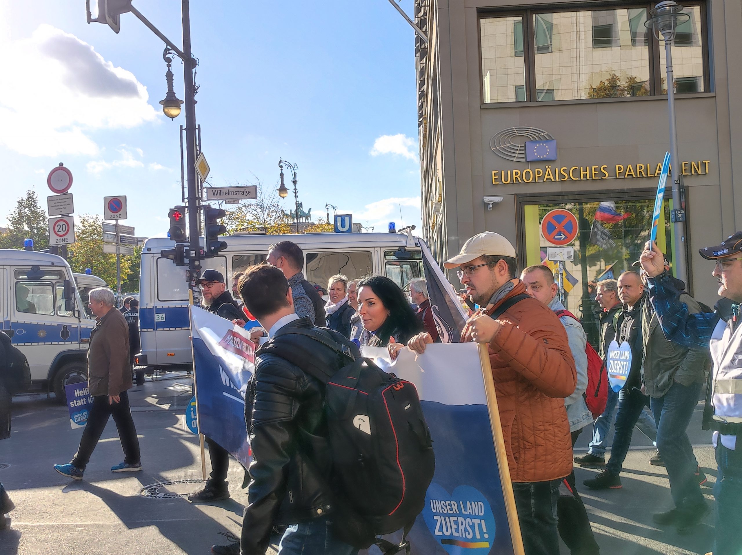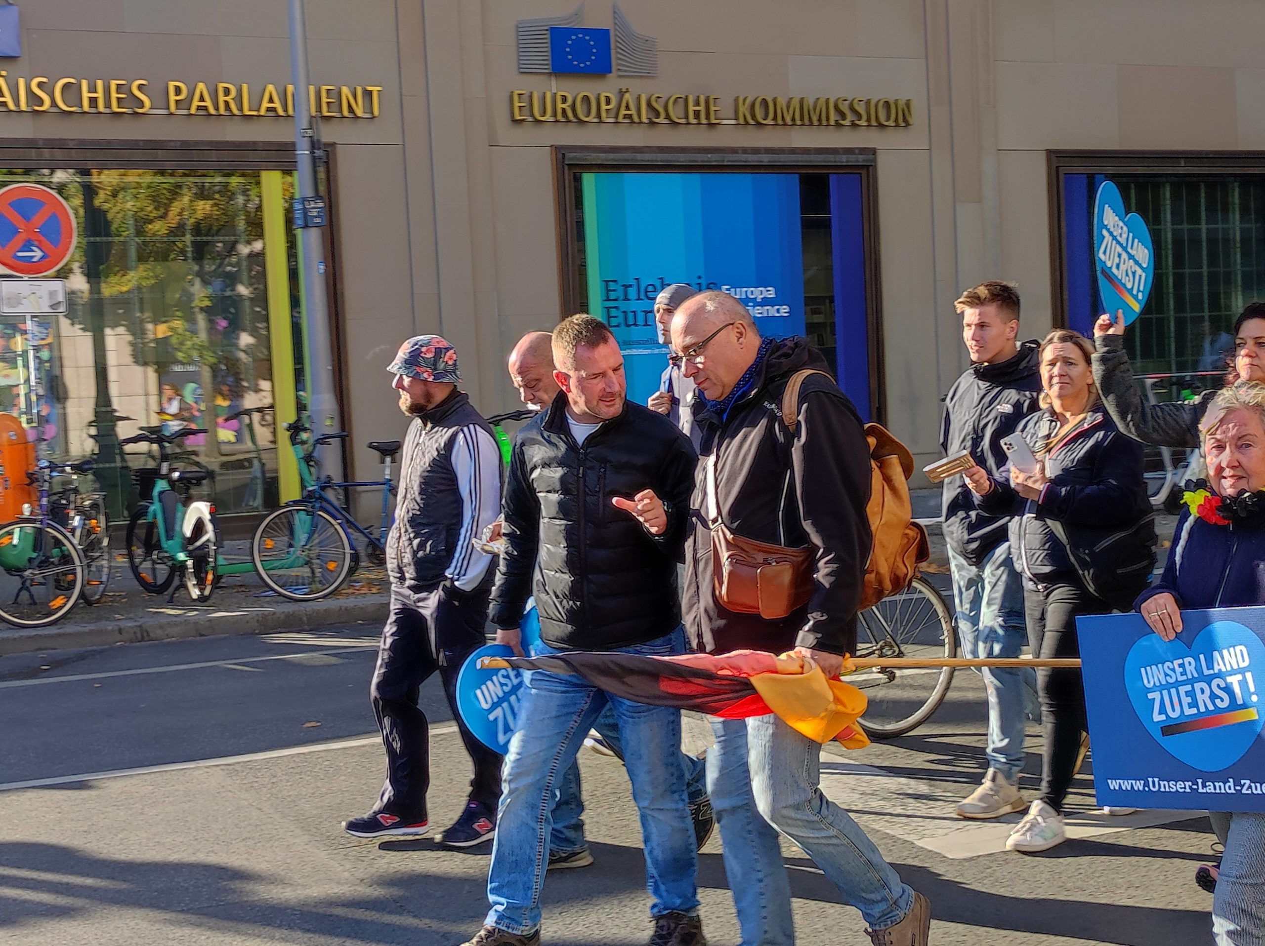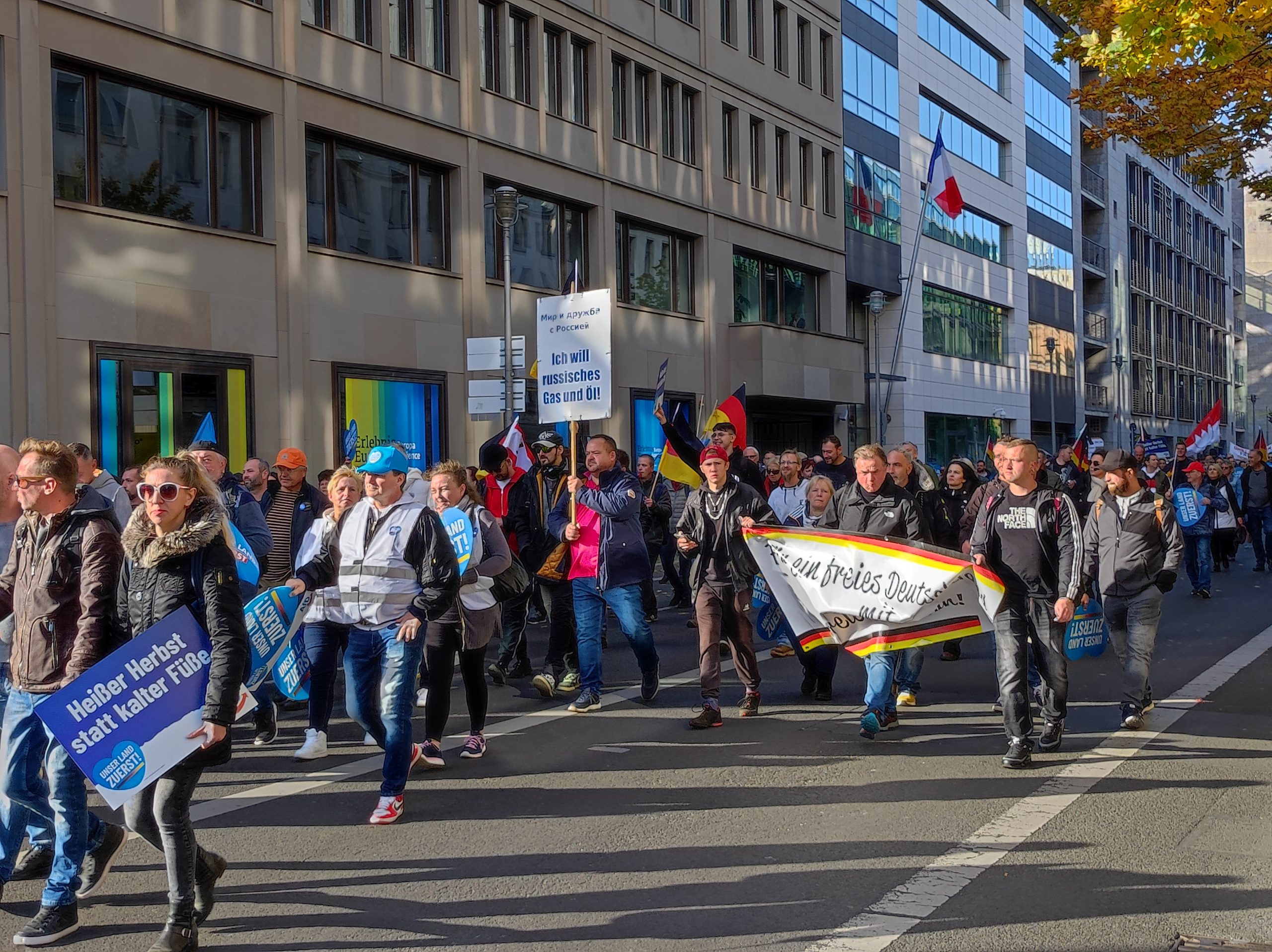 Es gibt nicht viel Positives zu berichten von der AfD-Herbstdemonstration in Berlin, am 08.10.2022. Die rechtsradikale Partei konnte ihre Auftaktkundgebung auf der Wiese vor dem Reichstag abhalten, dann durch das Berliner Regierungsviertel „spazieren“ und wieder vor dem Reichstag enden und dabei sich selbst feiern, nach dem Motto „Unser Land zuerst“ und mit viel AfD-Herzchen-Merchandise. Es war eine Feier der eigenen Existenz, mehr war es nicht, denn als ‚Inhalte‘ gab es nur die üblichen rechtsradikalen Talking Points (Hass auf die Regierung, Pressefeindlichkeit, Hass auf Gendern, Russlandliebe, Hass auf Geflüchtete, ja zu Kernkraft, schlechte Wortspiele mit heiß (Herbst) und kalt (Heizung)). Aber weniger war es auch nicht. Mit rund 10.000 Teilnehmenden wurden die anvisierten und angemeldeten 4.000 Anhänger*innen weit übertroffen. Und das trotz Zugausfall in Norddeutschland, was schon vor Demonstrationsbeginn zu wilden Verschwörungsfantasien in AfD-Kreisen führte, die auch auf der Abschlusskundgebung der AfD noch raunend angebracht wurde, warum man nicht noch mehr „Volk“ wäre.