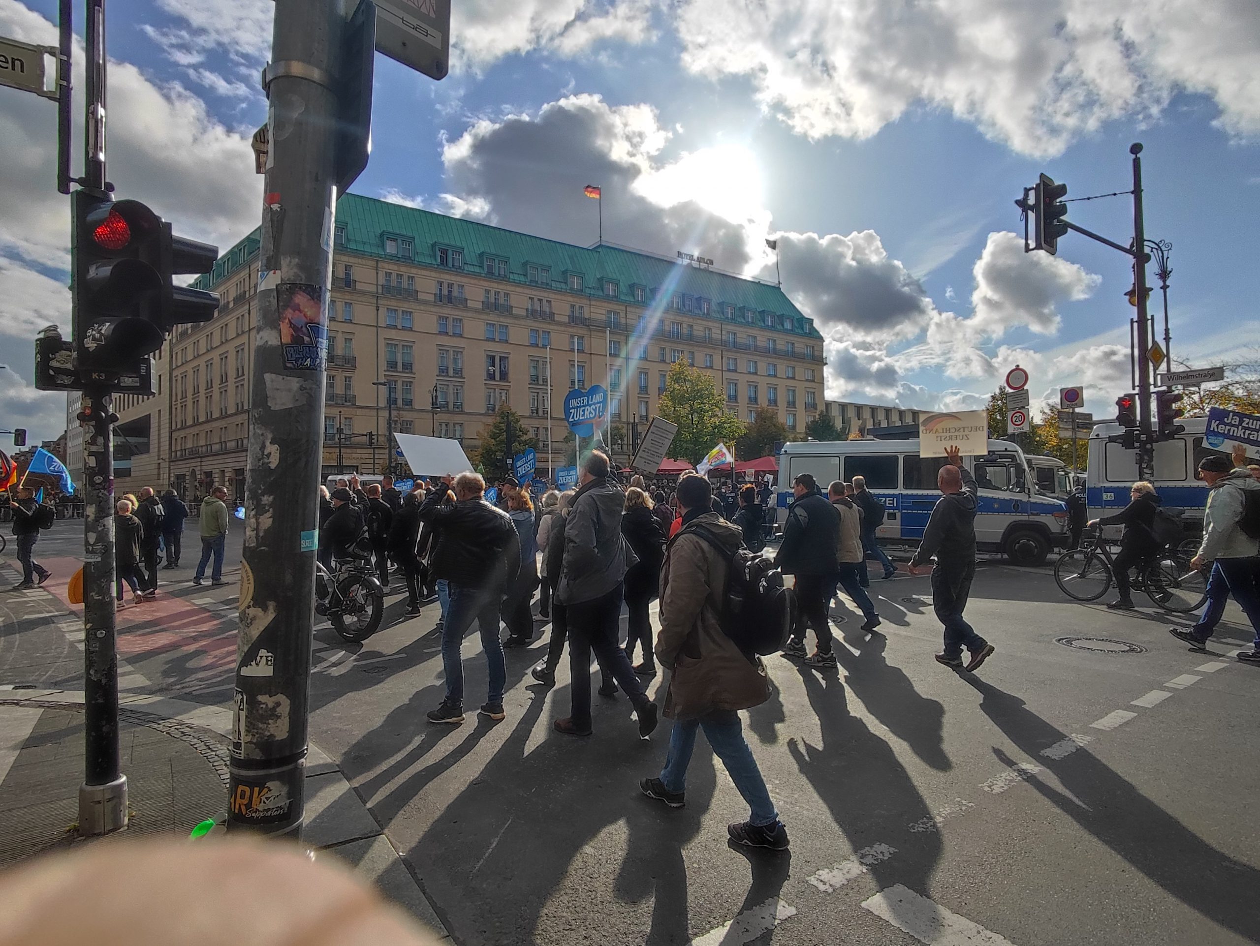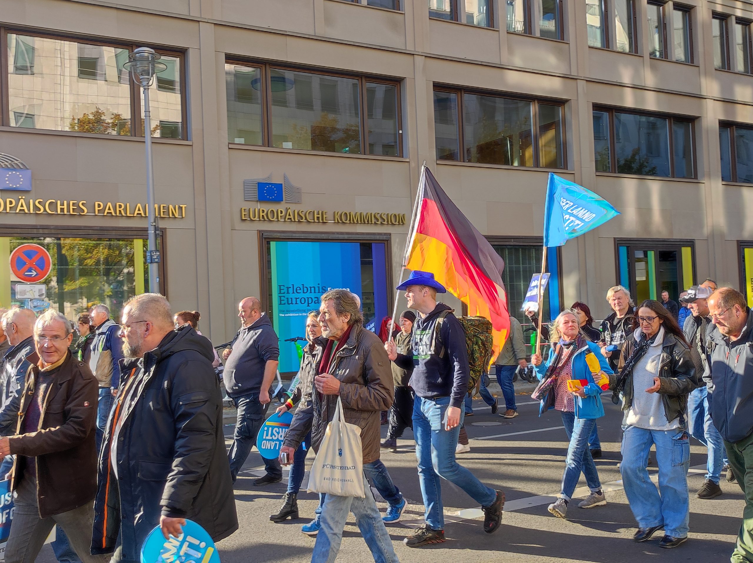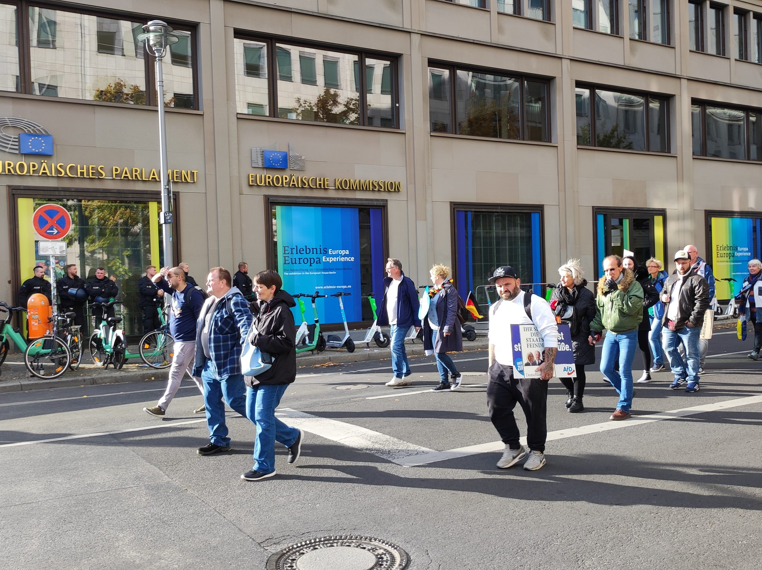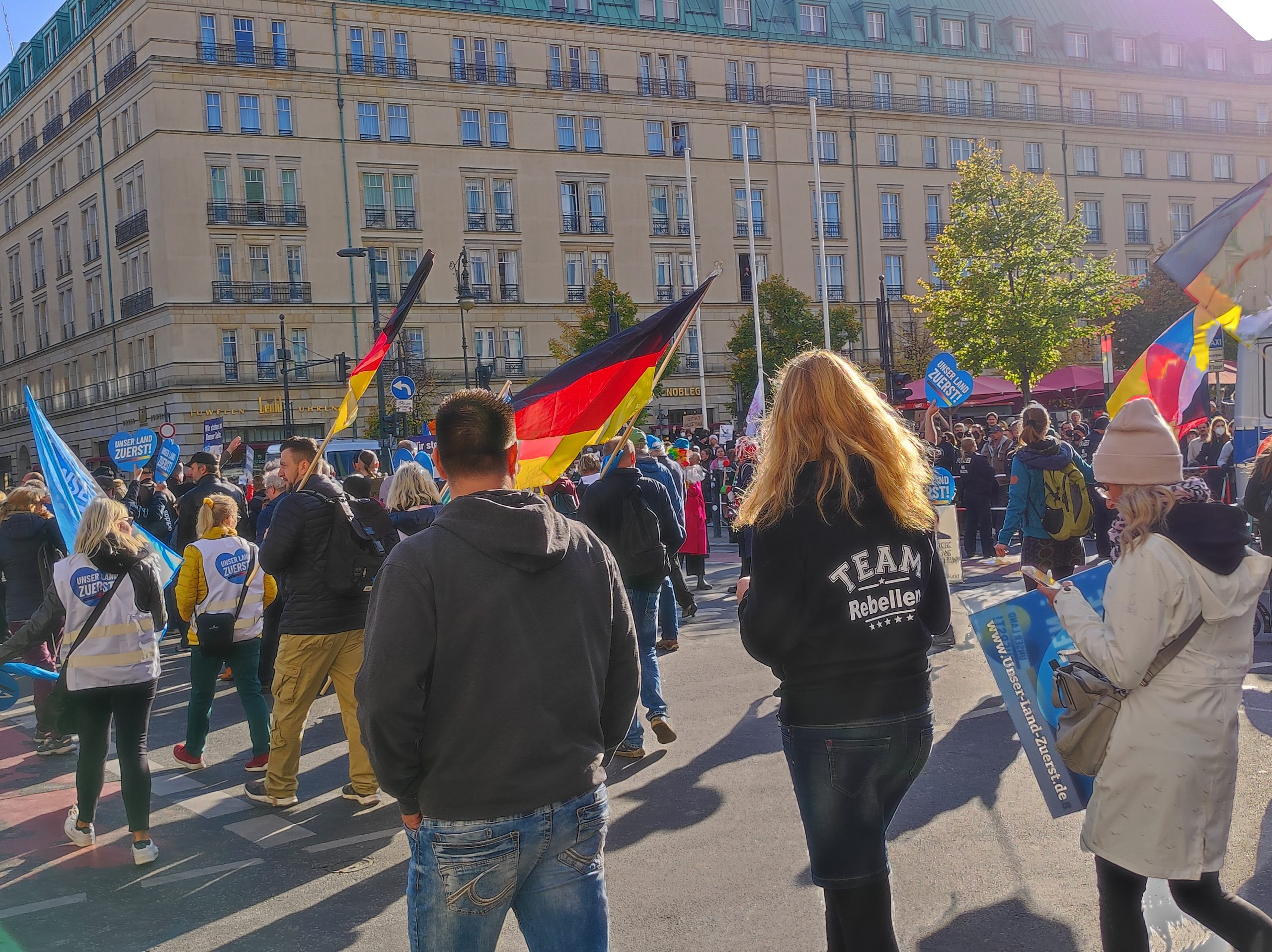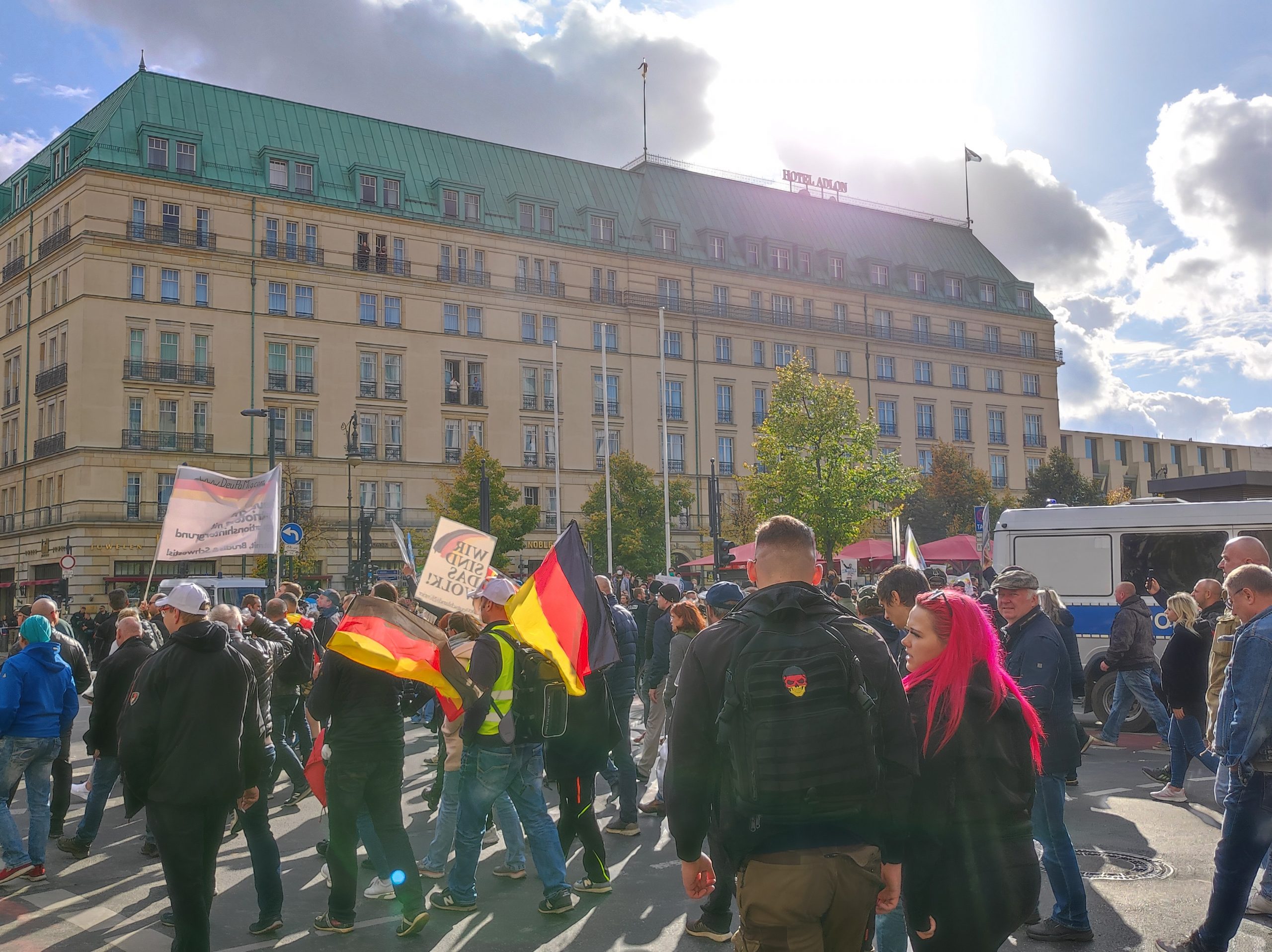 Es gibt nicht viel Positives zu berichten von der AfD-Herbstdemonstration in Berlin, am 08.10.2022. Die rechtsradikale Partei konnte ihre Auftaktkundgebung auf der Wiese vor dem Reichstag abhalten, dann durch das Berliner Regierungsviertel „spazieren“ und wieder vor dem Reichstag enden und dabei sich selbst feiern, nach dem Motto „Unser Land zuerst“ und mit viel AfD-Herzchen-Merchandise. Es war eine Feier der eigenen Existenz, mehr war es nicht, denn als ‚Inhalte‘ gab es nur die üblichen rechtsradikalen Talking Points (Hass auf die Regierung, Pressefeindlichkeit, Hass auf Gendern, Russlandliebe, Hass auf Geflüchtete, ja zu Kernkraft, schlechte Wortspiele mit heiß (Herbst) und kalt (Heizung)). Aber weniger war es auch nicht. Mit rund 10.000 Teilnehmenden wurden die anvisierten und angemeldeten 4.000 Anhänger*innen weit übertroffen. Und das trotz Zugausfall in Norddeutschland, was schon vor Demonstrationsbeginn zu wilden Verschwörungsfantasien in AfD-Kreisen führte, die auch auf der Abschlusskundgebung der AfD noch raunend angebracht wurde, warum man nicht noch mehr „Volk“ wäre.