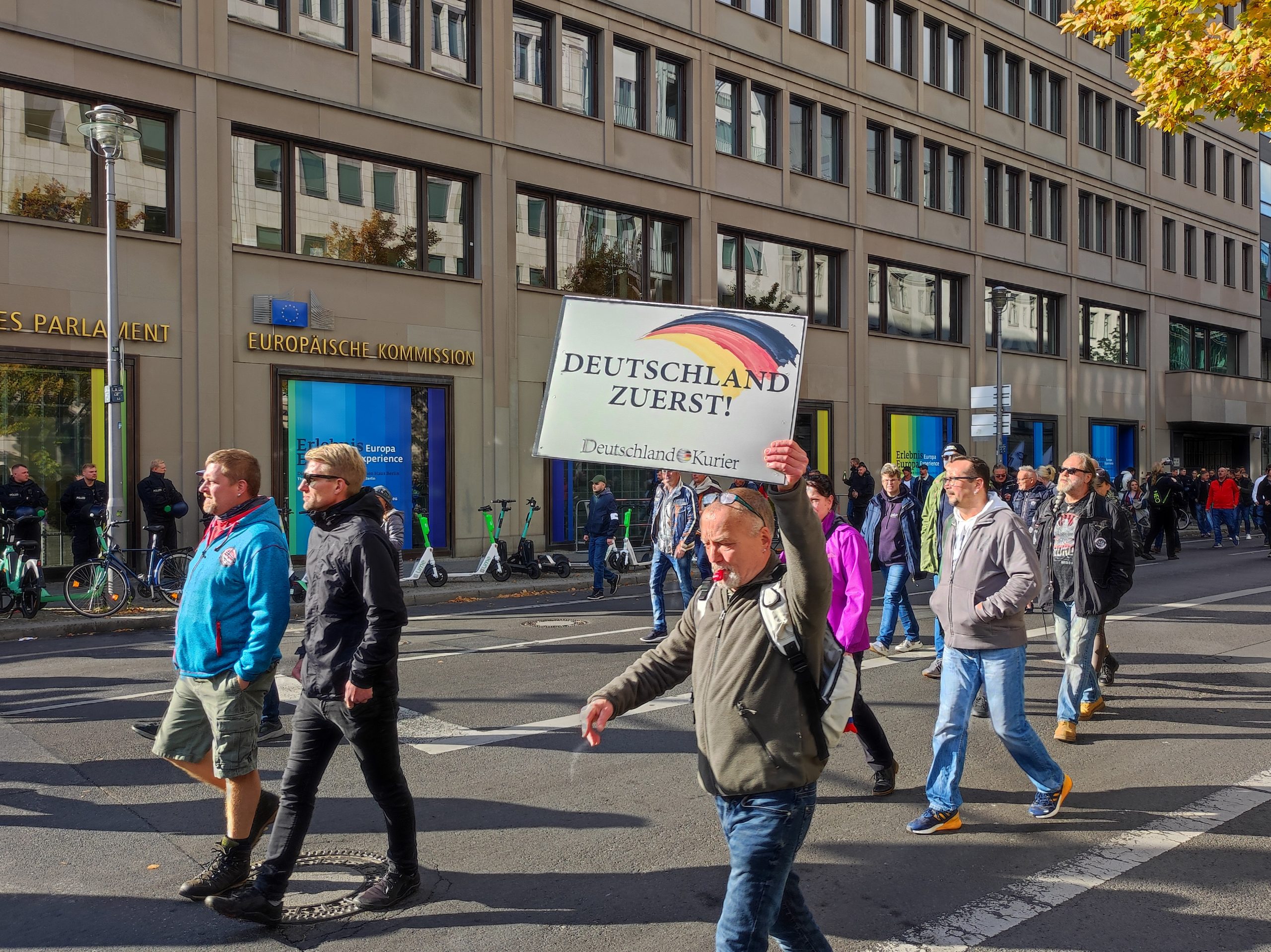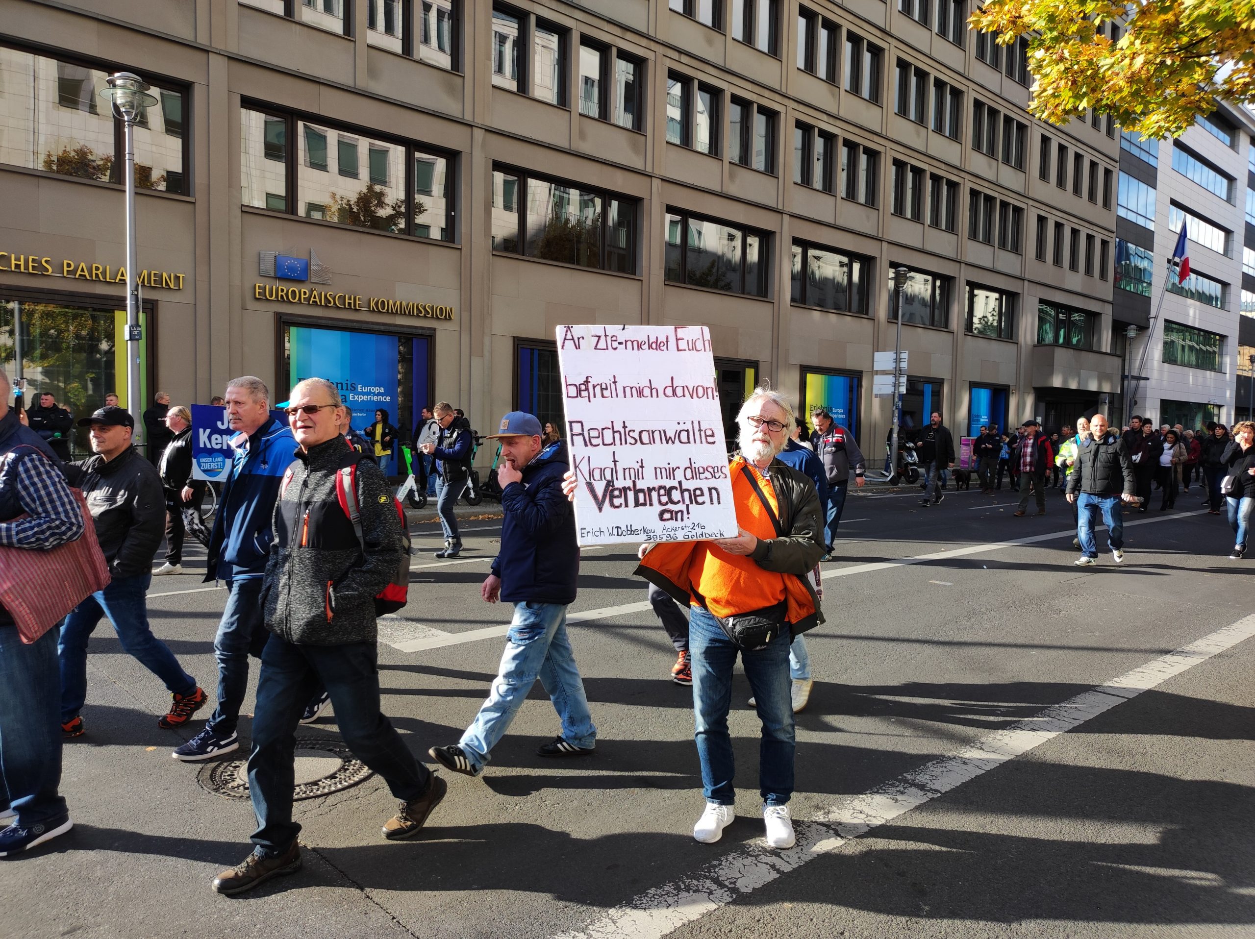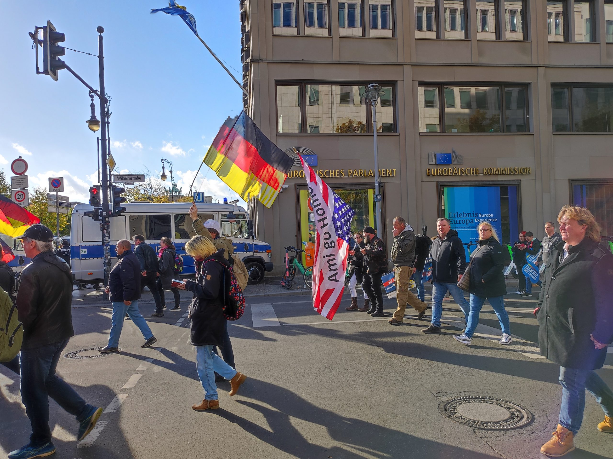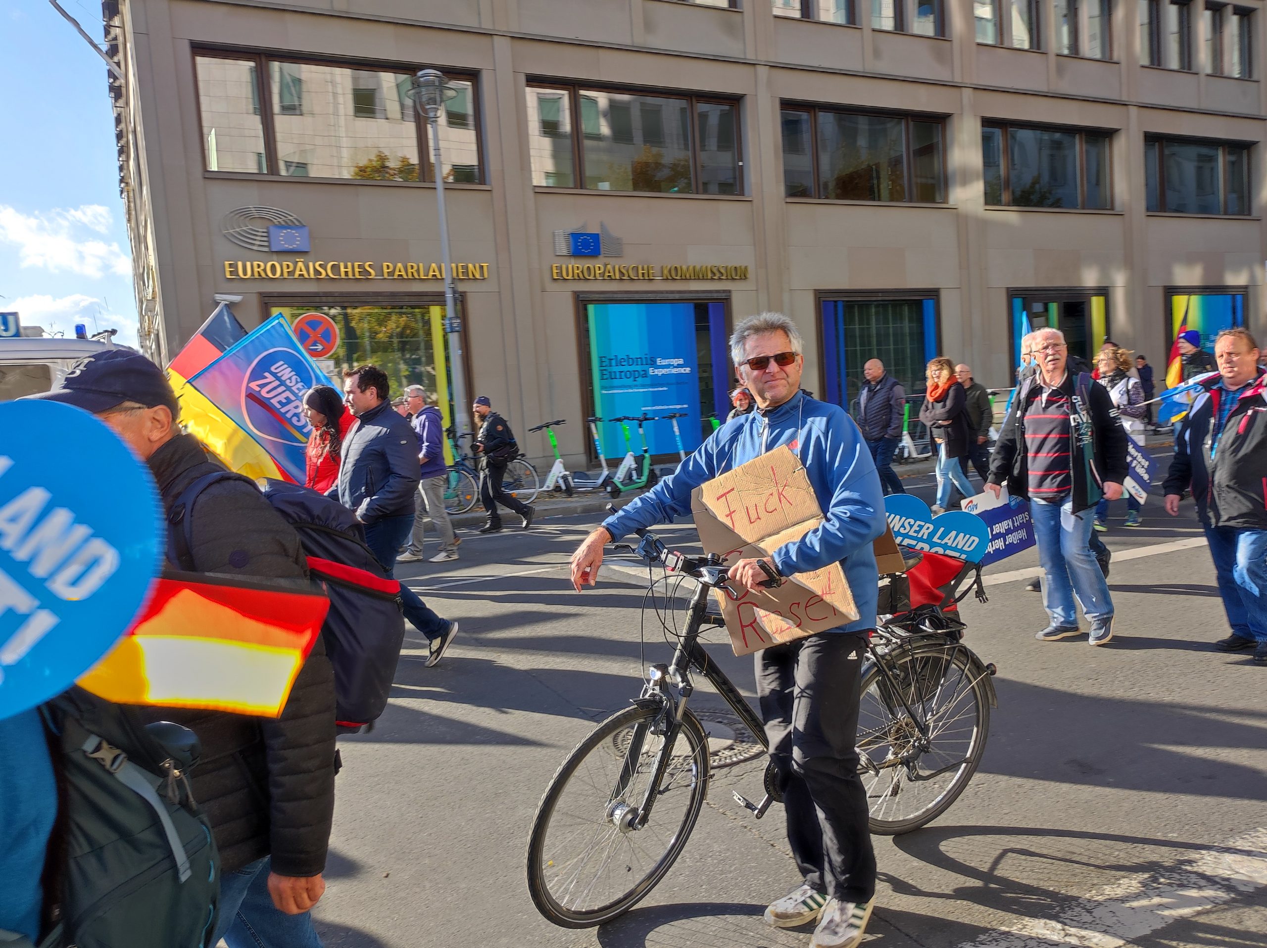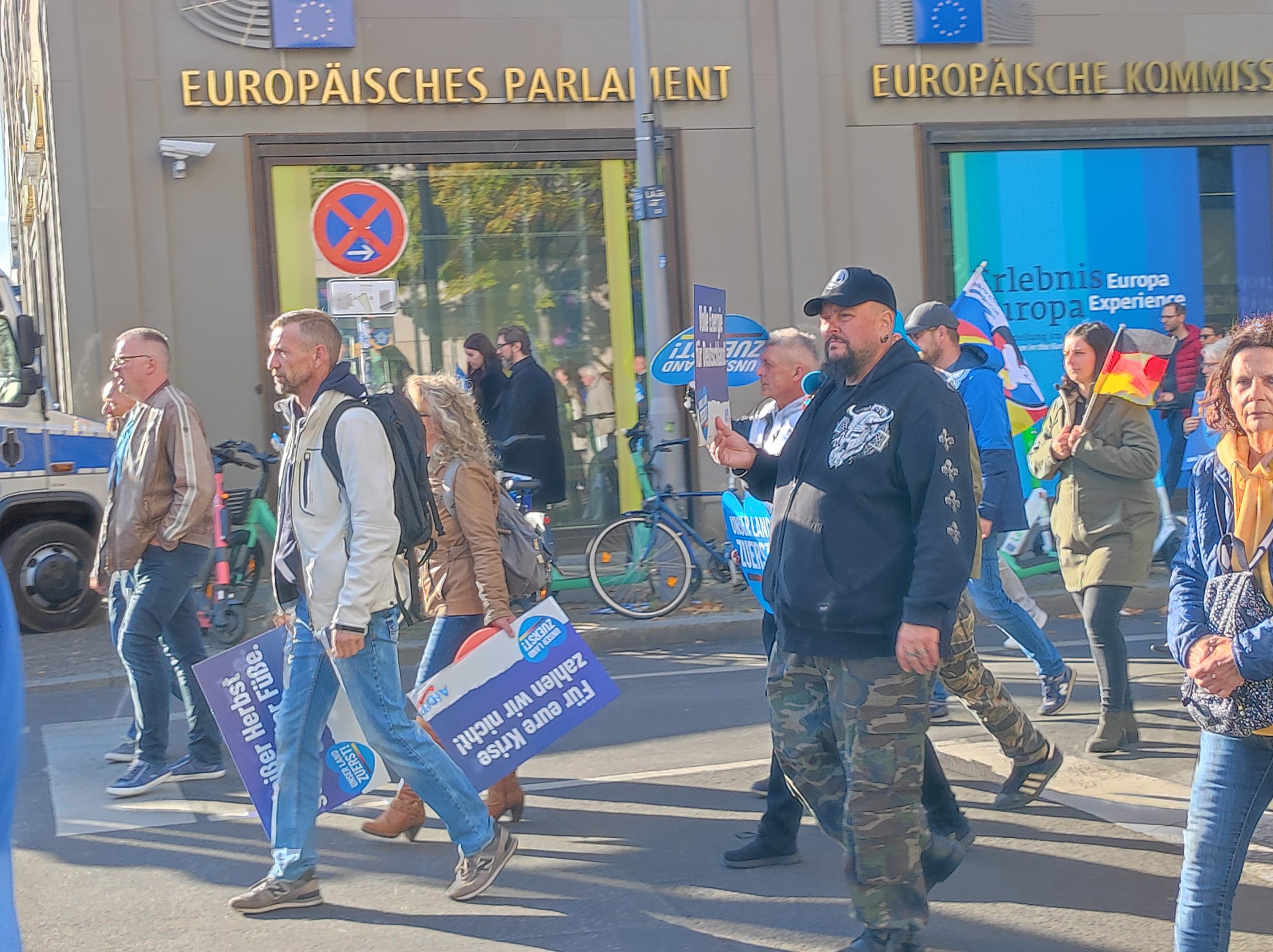 Eröffnet wird die Veranstaltung vom farblosen Bundessprecher Tino Chrupalla. Bundessprecherin Alice Weidel ist nicht da, krank, von ihr gibt es nur ein Video. Als Scharfmacher fungiert ihr Stellvertreter, Stephan Brandner, der trägt dann auch mittig das Frontbanner, weiteres AfD-Personal darf begleiten, wie Beatrix von Storch, Dennis Hohloch, Marc Jongen und Tino Chrupalla. Wenn es etwas Positives gibt, dann vielleicht, dass die Szene-Mischungen, die die Coronaleugnungs-Demonstrationen so mächtig wie beunruhigend machten, auf der AfD-Demonstration am 08. Oktober in Berlin nicht mehr gegeben sind. Hier sind keine verschwörungsideologisch oder durch die Pandemiekrise verwirrte Menschen aus der Mehrheitsgesellschaft auf der Straße, keine „besorgten Bürger*innen“ – sondern überzeugte Rechtsradikale, die wissen, was sie tun. Einige von ihnen waren allerdings zuvor Pandemieleugner*innen. Hier haben sich auch Dinge verschmolzen.