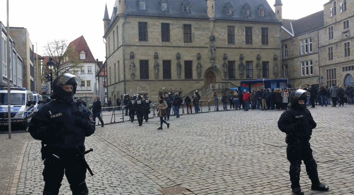 Lediglich 30 bis 40 AfD-Sympathisant_innen fanden sich am Dienstagabend auf dem Rathausplatz in Osnabrück ein, der , trotz des großen Polizeiaufgebots beinahe menschenleer wirkte. Niedersachsens AfD-Landeschef Armin Paul Hempel versuchte, der beschaulichen Menge einzuheizen. Doch schon seine hetzerischen Parolen gingen im lauten Getöse der rund 2.000 Gegendemonstrant_innen unter.