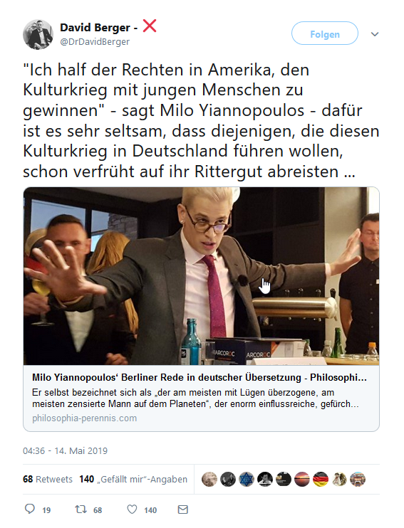 Dass sich Stimmen von Rechtsaußen an der Konferenz im Bundestag stören, liegt allerdings nicht so sehr an Antisemitismus und Geschichtrevisionismus, sondern offenbar stark an der Personalie Milo Yiannopoulos. So war auch Götz Kubitschek mitsamt Gattin Ellen Kositza vor Ort. Das Fazit des Kleinverlegers, den seine Fans gerne als „intellektuell“ und „Vordenker“ der sogenannten „neuen“ Rechten feiern, fällt eher neutral aus. Explizit erwähnt er allerdings auf seinem Blog die Abreise vor Yiannopoulos Auftritt. Das wiederum findet David Berger – der mittlerweile geschlagene zehn begeisterte Artikel im Zusammenhang mit der Konferenz auf seinem Blog veröffentlicht hat – „seltsam“.