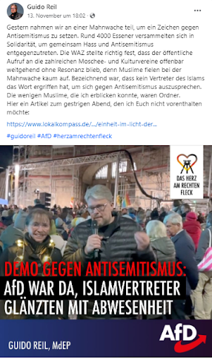 Der Essener AfD-Politiker Guido Reil zeigt sich in einem Facebok Post solidarisch gegen Antisemitismus. Aber nicht ohne über die scheinbare Abwesenheit von „Vertreter[n] des Islams” zu sprechen. „Gestern nahmen wir an einer Mahnwache teil, um ein Zeichen gegen den Antisemitismus zu setzen. Rund 4000 Essener versammelten sich in Solidarität, um gemeinsam Hass und Antisemitismus entgegenzutreten. […] Muslime fielen bei der Mahnwache kaum auf. Bezeichnend war, dass kein Vertreter des Islams das Wort ergriffen hat, um sich gegen Antisemititsmus auszusprechen.”