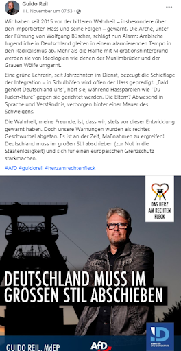 Stark in Sozialen Netzwerken vertretene AfD-Politiker*innen betonen häufig, dass sie schon seit Jahren alle vor der angeblichen „bitteren Wahrheit” warnen. So postet Guido Reil zum Beispiel auf Facebook sein Pamphlet: „Wir haben seit 2015 vor der bitteren Wahrheit – insbesondere über den importierten Hass und seine Folgen – gewarnt. Die Arche, unter der Führung von Wolfgang Büscher, schlägt nun Alarm: Arabische Jugendliche in Deutschland würden in einem alarmierenden Tempo in den Radikalismus abgleiten. Mehr als die Hälfte mit Migrationshintergrund werden sie von Ideologien wie denen der Muslimbrüder und der Grauen Wölfe umgarnt.”