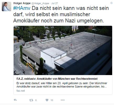 Während Arppe pausenlos von einem allgegenwärtigen Linksextremismus schwadroniert, scheint Rechtsextremismus in seiner Welt nicht zu existieren. Nachdem sich herausstellt, dass der Attentäter von München aus rassistischen und rechtsextremen Motiven gehandelt hat, twittert Arppe: „Da nicht sein kann was nicht sein darf, wird selbst ein muslimischer Amokläufer noch zum Nazi umgelogen.“