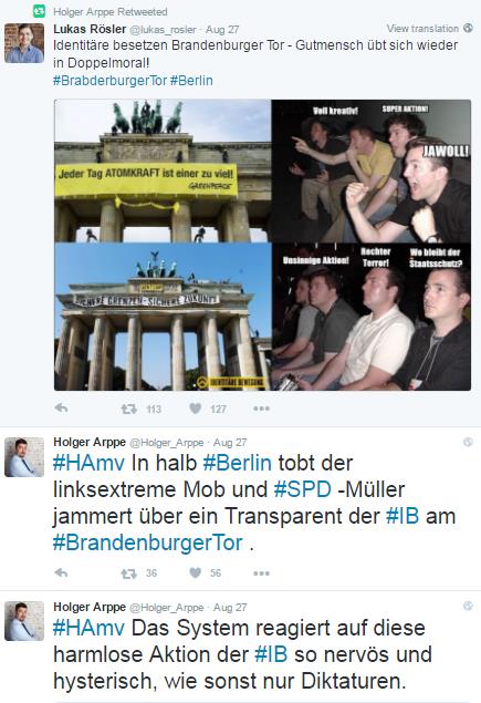 Aus seiner Sympathie für die neurechte „Identitäre Bewegung“ macht Arppe kein Geheimnis. Besonders die kurzzeitige Besetzung des Brandenburger Tors durch Identitäre, löst bei Arppe eine ganze Reihe von Tweets aus.
