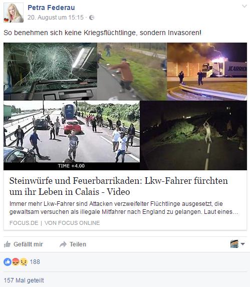 Für Schwerin tritt Petra Federau als Direktkandidatin an. Auf ihrem offiziellen Facebook-Profil gibt sie sich gemäßigt. Über ihr privates Profil äußert sie sich in einem ganz anderen Ton. Dass AfD-Politiker_innen Geflüchteten immer wieder kriminelle Absichten unterstellen, ist inzwischen bekannt. Für Federau besteht zwischen Flüchtlingen und Straftäter_innen aber offensichtlich überhaupt kein Unterschied. Stattdessen die immer gleiche Bezeichnung von Geflüchteten als „Invasoren“.