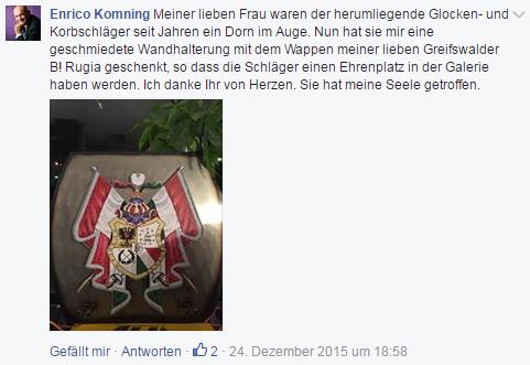 Enrico Komning (Listenplatz 4) sympathisiert auf Facebook ebenfalls offen mit der extrem rechten „Identitären Bewegung“. Gut findet er auch die „Grauzonistische Reaktion“, in deren Beschreibung es heißt: „Wir stehen gegen dieses links- und öko-faschistische Drecksgefolge!“ Außerdem gefallen Komning der Volksmusiker Andreas Gabalier, Pegida und zahlreiche Burschenschaften. Letzteres überrascht nur wenig. Komning ist selbst Mitglied in der extrem rechten Burschenschaft „Rugia“, aus der auch schon zahlreiche hochrangige NPD-Mitglieder hervorgegangen sind. Komning scheint in der Burschenschaft noch immer aktiv zu sein. Im vergangenem Jahr freute er sich auf der Seite der „Rugia Greifswald“ herzlich über das Weihnachtsgeschenk seiner Frau: eine Halterung für seine Korbschläger (die Fechtwaffen die beim Kampf zwischen zwei Mitgliedern verschiedener Studentenverbindungen benutzt werden).