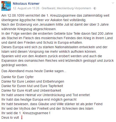 Nikolaus Kramer, Listenplatz 8, fällt durch islamfeindliche Posts auf. Mit viel Pathos bedankt er sich etwa bei der „1. Kreuzzugsarmee“ für die „Rettung des Abendlandes“ vor den „moslemischen Feinden“.