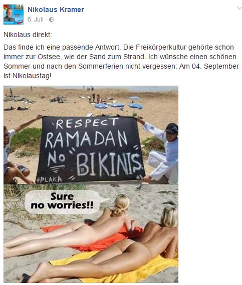 Dann setzt sich die AfD also im aktuellen Wahlkampf für Feminismus ein? Ein Blick auf die Facebookprofile der AfD-Mitglieder zeigt das Gegenteil. Sexismus und Antifeminismus kann die AfD offensichtlich selbst ziemlich gut. Jens Kühnel, Listenplatz 21, mag die Facebook-Gruppe „Die gute Hausfrau saugt auch nachts unter der Decke weiter“. Enrico Komning findet Blondinenwitze lustig. Und Nikolaus Kramer zeigt bei Facebook, wie sich Sexismus und Islamfeindlichkeit in einem Bild kombinieren lassen: