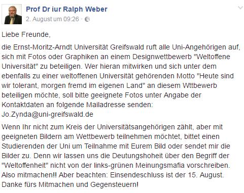 Nicht nur bei den Listen- auch bei den Direktkandidat_innen zeigt sich, dass die AfD nicht so gemäßigt ist, wie Holm und Manthei sie nach außen zu repräsentieren versuchen. Ralph Weber ist Direktkandidat für Vorpommern-Greifswald. Der Jura-Professor ist kein Unbekannter: Er trägt in der Uni „Thor Steinar“ und promovierte einen bekannten Brandenburger Neonazi. Im August ruft er bei Facebook zu einem Wettbewerb auf, mit dem er sich gegen die „Fremdheit im eigenen Land“ und die „links-grüne Meinungsmafia“ richten möchte.