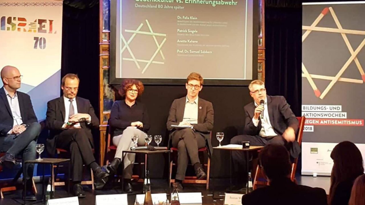Passend zu diesen Schwerpunkten gibt es zwei Podiumsdiskussionen bei der Eröffnungsveranstaltung am 08.11.2018 in Berlin. Felix Klein, Patrick Siegele, Direktor des Anne Frank Zentrums Berlin, Anetta Kahane, Vorsitzende der Amadeu Antonio Stiftung, und Professor Samuel Salzborn von der TU Berlin diskutierten über Gedenkkultur und Erinnerungsabwehr, 80 Jahre nach den Pogromnächten. Für Klein stehtdabei besonders Bildung im Vordergrund. In deutschen Schulbüchern werde zwar der Holocaust behandelt, das vielfältige jüdische Leben in Deutschland vor der Shoah allerdings kaum: „Jüdisches Leben ist ein integraler Bestandteil unserer Kultur. Wer das angreift, greift unser aller Leben an. Wir müssen klar machen, dass der Antisemitismus 1945 nicht vorbei war. Gleichzeitig müssen Lehrer Antisemitismus klar erkennen können.“ Samuel Salzborn betonte die wichtige Rolle der Zivilgesellschaft im Kampf gegen Antisemitismus,: „Wenn Antisemiten sich bestärkt fühlen, sich öffentlich zu artikulieren und das dann auf die Straße tragen, bedarf es einer demokratischen Gegenwehr. Allerdings hört man da zur Zeit oft nur ein dröhnendes Schweigen.“ Beim Hass auf Juden und Jüdinnen geht es nicht nur um einzelne Menschen, sondern um den Hass auf grundlegende zivilisatorische Errungenschaften, so Anetta Kahane: „Die Menschen in diesem Land müssen verstehen, dass Antisemitismus den Kern der Gesellschaft, den Universalismus, die Gleichberechtigung, die Demokratie in Frage stellt.“