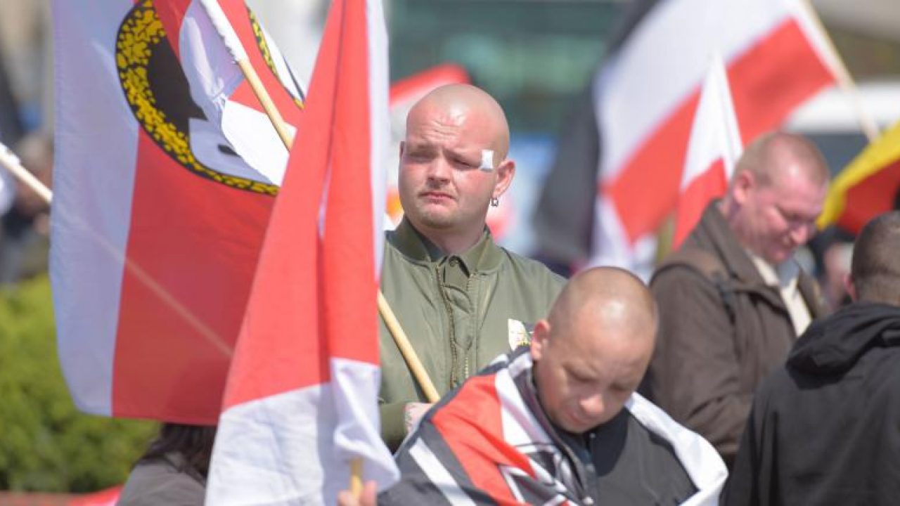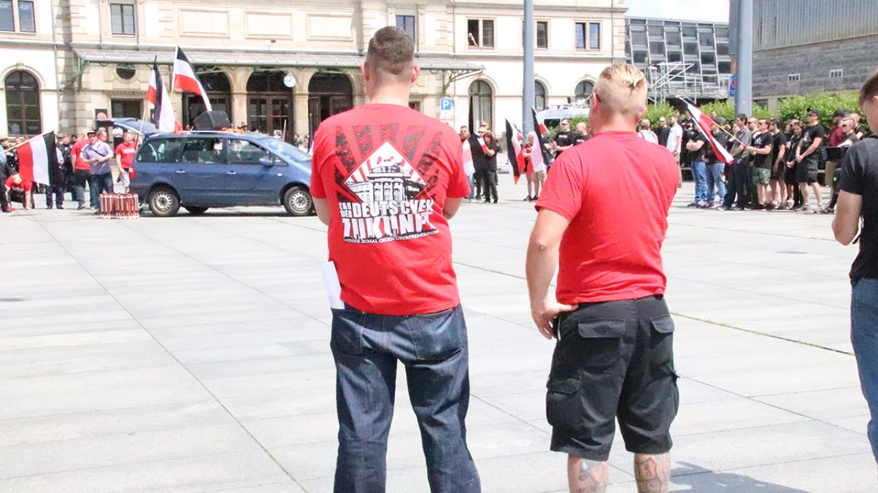 Dort hatten sie von 12 bis 19 Uhr ihr „Fest der Völker“ angemeldet, ein Propaganda-Konzert im Sinne völkischer Naziideologie mit rechten Szene-Bands aus ganz Europa. Die vorbereitete Bühne hatten sie mit einem Banner drapiert, das zwei Weltkriegssoldaten zeigte, dazu der Spruch: „Brothers in arms of Europe in the alliance for freedom – Waffenbrüder Europas im Bunde für Freiheit“.