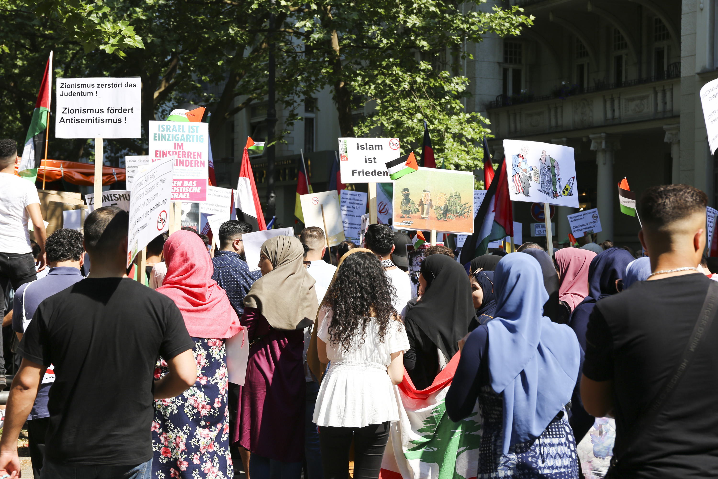 Laut Polizeiangaben nahmen 1.600 Menschen an der Demonstration teil. Zu Beginn wurde ein lange Liste mit Auflagen verlesen, die unter anderem das Verbrennen von Flaggen und das Zeigen von Symbolen der Terrororgansiation Hisbollah untersagte. Trotzdem wurde im Verlauf der Demo eine Fahne mit dem entsprechenden Logo sichergestellt.