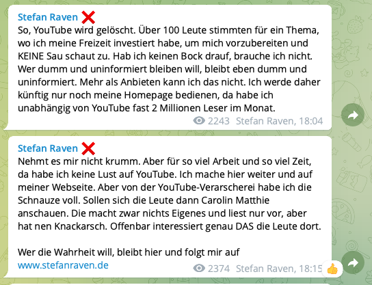 Dabei ist Michels trotz vermeintlich skandalöser Vergangenheit nur mäßig erfolgreich im Corona-Leugner-Business. Seine Inhalte vertreibt der Verschwörungsfan hauptsächlich über Telegram, hier hat er knapp 6.400 Abonnent:innen. Einen YouTube-Kanal betreibt Michels offenbar nicht mehr. In einer empörten Telegramnachricht von Januar 2021 kündigte er seinen Rückzug von der Videoplattform an, nicht etwa, weil seine Videos gelöscht wurden, sondern weil sie schlicht zu wenig Leute interessierten: „Über 100 Leute stimmten für ein Thema, wo ich meine Freizeit investiert habe, um mich vorzubereiten und KEINE Sau schaut zu.“