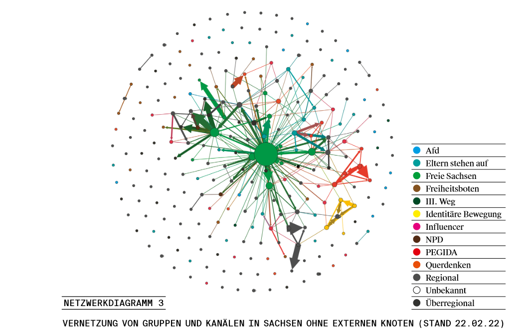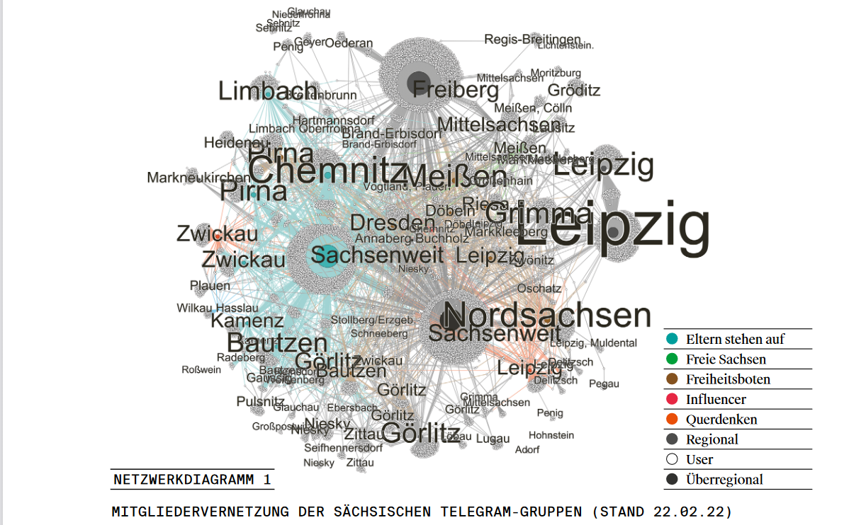 Freiheit“ beworben wurden, fanden sich auf Telegram multiple Kleingruppen zur Organisation dezentraler Proteste in Sachsen (Dresden, Leipzig, Frankenthal, Zwickau, Plauen). Diese rege besuchten Gruppen sind inzwischen in Sachsen deutlich geschrumpft. Es findet kaum noch Austausch innerhalb der Gruppen statt, die meisten Beiträge sind Reposts aus größeren Kanälen oder Gruppen. Als Verstärker spielen sie somit noch eine untergeordnete Rolle.