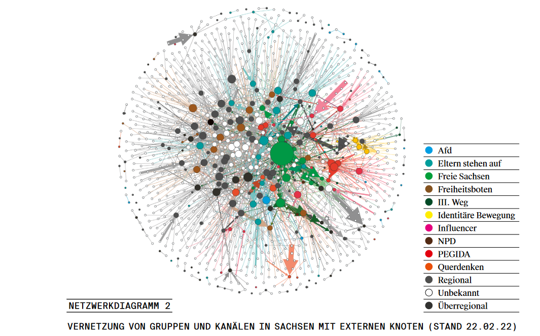 Eingefärbte Kreise stehen für sächsische Gruppen und Kanäle aus der untersuchten Menge. Farblose Kreise sind zusätzlich ermittelte Kanäle und Gruppen, aus denen ebenfalls Nachrichten stammen. Diese machen fast 80 Prozent aus, was für eine starke Einbindung der sächsischen Gruppen und Kanäle in ein bundesweites Netzwerk spricht, und werden im Weiteren „externe Gruppen und Kanäle“ genannt. Die Größe der Kreise ergibt sich aus der Häufigkeit der Weiterleitungen innerhalb der untersuchten Menge. Die Dicke der Verbindung steht für die Häufigkeit der Nachrichten-Weiterleitung zwischen jeweils zwei Gruppen/Kanälen. Der Pfeil zeigt die Richtung der Weiterleitung an. Kreise ohne Verbindung sind