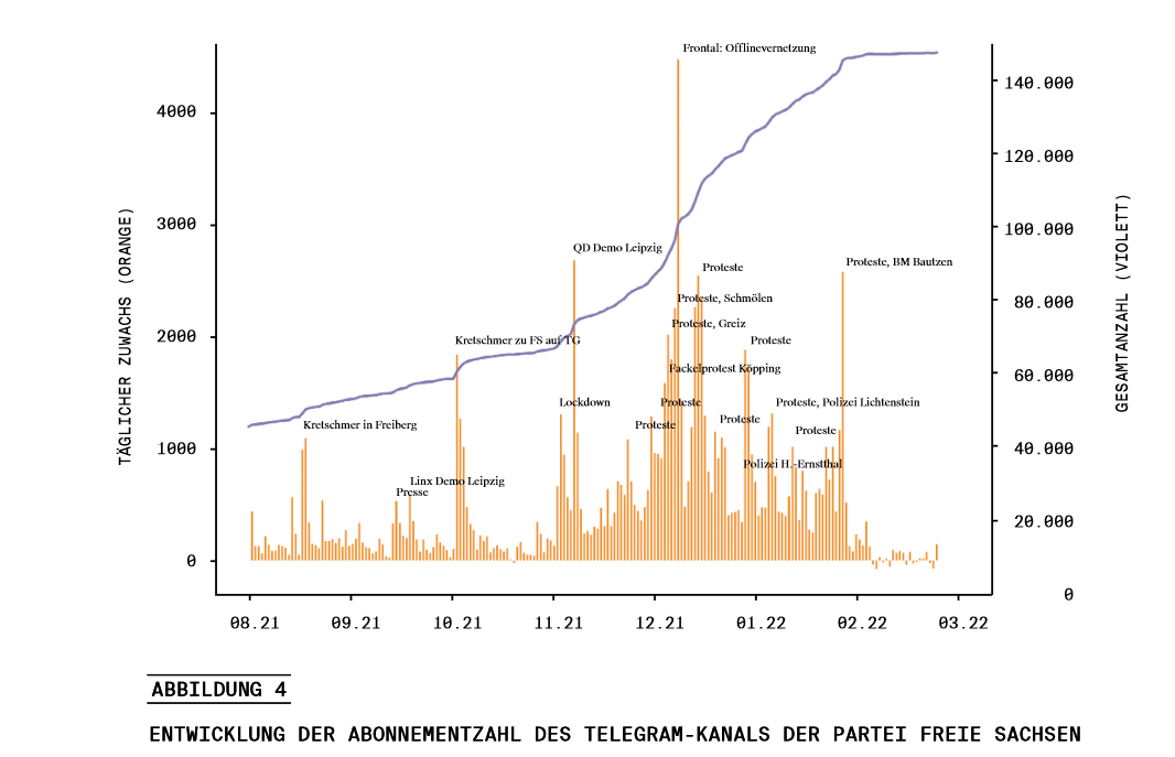 Mitgliedszahlen des Hauptkanals der Freien Sachsen (Abbildung 4) lassen sich deutliche Peaks erkennen, die in engem zeitlichen Zusammenhang mit Protesten stehen. Außerdem scheinen Medienbeiträge (z.B. zur Einführung von 2G-Regeln in Sachsen) und politische Debatten zu umstrittenen Themen zu einem Anstieg der Mitgliedszahlen zu führen. Die Freien Sachsen profitie-