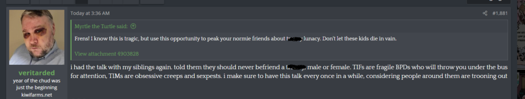 Auf Plattformen wie 4chan und Kiwi Farms ist der Ton noch einmal deutlich brutaler. Die Userbasis, die ansonsten jeden Terroranschlag und jeden Amoklauf mit zynischer Begeisterung bejubelt und vor allem Incels und Rechtsterroristen als „Heilige“ und „Helden“ verehrt, entdeckt mit einem Mal ihre Empathie für erschossene Kinder. Begeistert teilen sie das Video der Polizeibeamt*innen, die den Amokläufer erschießen und kommentieren das Material mit Aussagen wie „TOTALER TR****N TOD!“ Vor allem jedoch ergießen sich die Nutzer*innen in offener Schadenfreude über die berechtigte Angst von queeren Menschen, dass die US-amerikanische Rechte die Transgeschlechtlichkeit des Schützens als Grundlage für weitere Repressionen heranziehen wird.