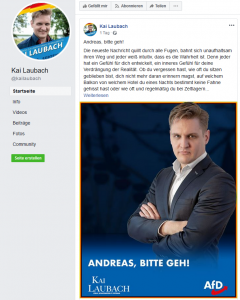 In eine ähnliche Richtung gehen Vorwürfe, die Kai Laubach auf Facebook erhebt, ein Mitarbeiter des AfD-Abgeordneten Lars Hünich. Dabei hat Laubach selbst Kontakte zur rechtsextremen Szene, hier aber zur etwas weniger gewaltaffinen „Identitären Bewegung“.