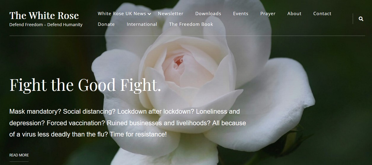 „The White Rose“ besteht aus einer Reihe von internationalen Anti-Lockdown-Gruppen mit dem Zentrum in Großbritannien. Auf einer Website der Gruppe beschreibt sie sich als „friedliche Widerstandsgruppe mit Sitz in Großbritannien“. Laut Website-Domain-Information wurde die Website am 30. Oktober 2020 erstellt. Die Website enthält die inzwischen bekannten COVID-Verschwörungs-Tropen: Bill Gates ist für das Virus verantwortlich, die Grippe ist gefährlicher als COVID-19, der Lockdown ist der Beginn des „Great Reset“, 5G verursacht COVID-19-Symptome, und so weiter. Auf einer archivierten Version der Website vom November 2020 wirbt die Gruppe für eine Anti-Lockdown-Demonstration.